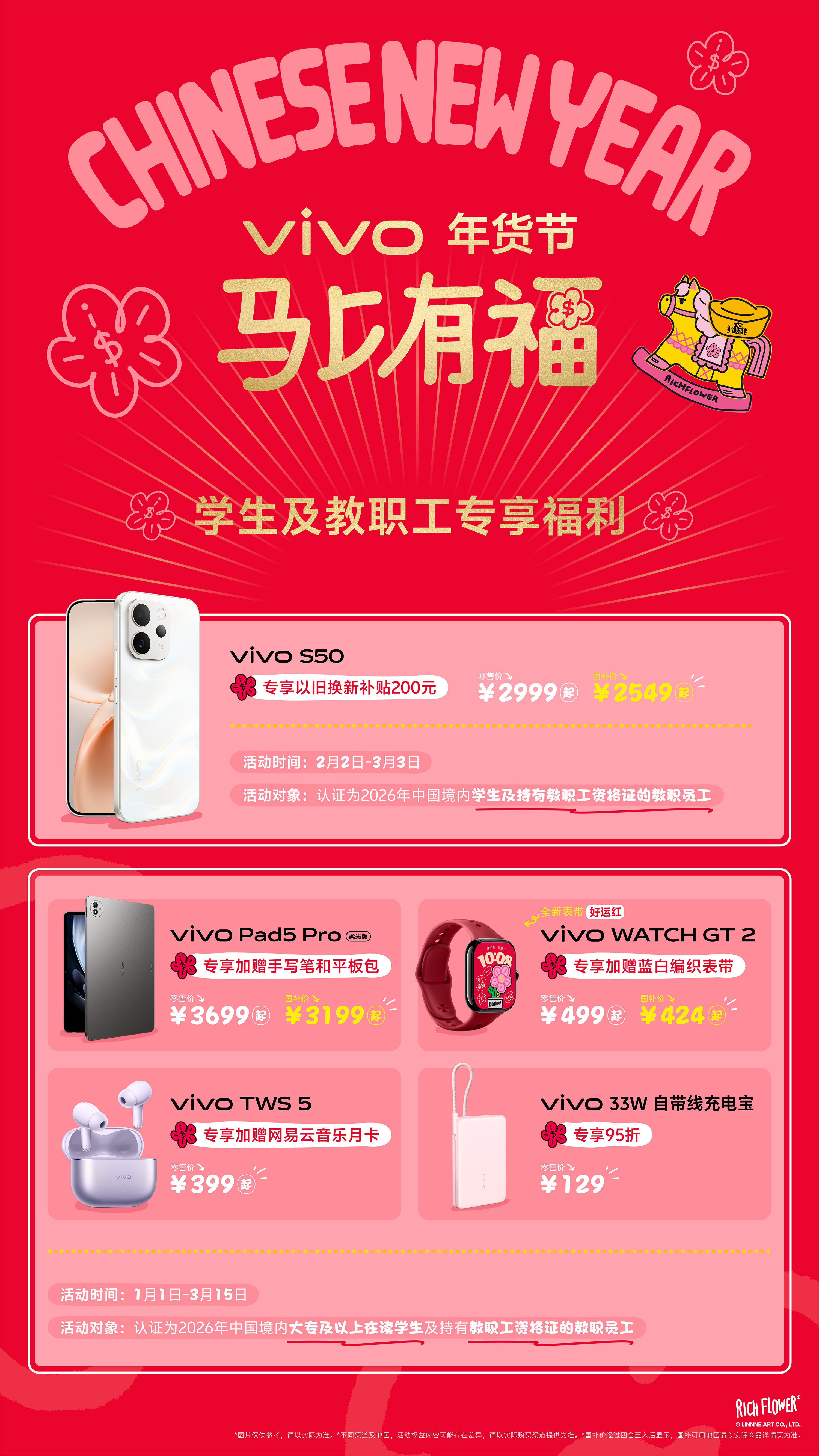 而且即日起至3月3日,学生党和老师们还可获得专享福利,vivo S50国补后只要2549元起,还能再叠加200元以旧换新补贴,要是入手vivo Pad5 Pro 柔光版、vivo TWS 5等在内的几款新品,还有手写笔、平板包、网易云音乐月卡等各种好礼权益送,新学期换新装备正合适。