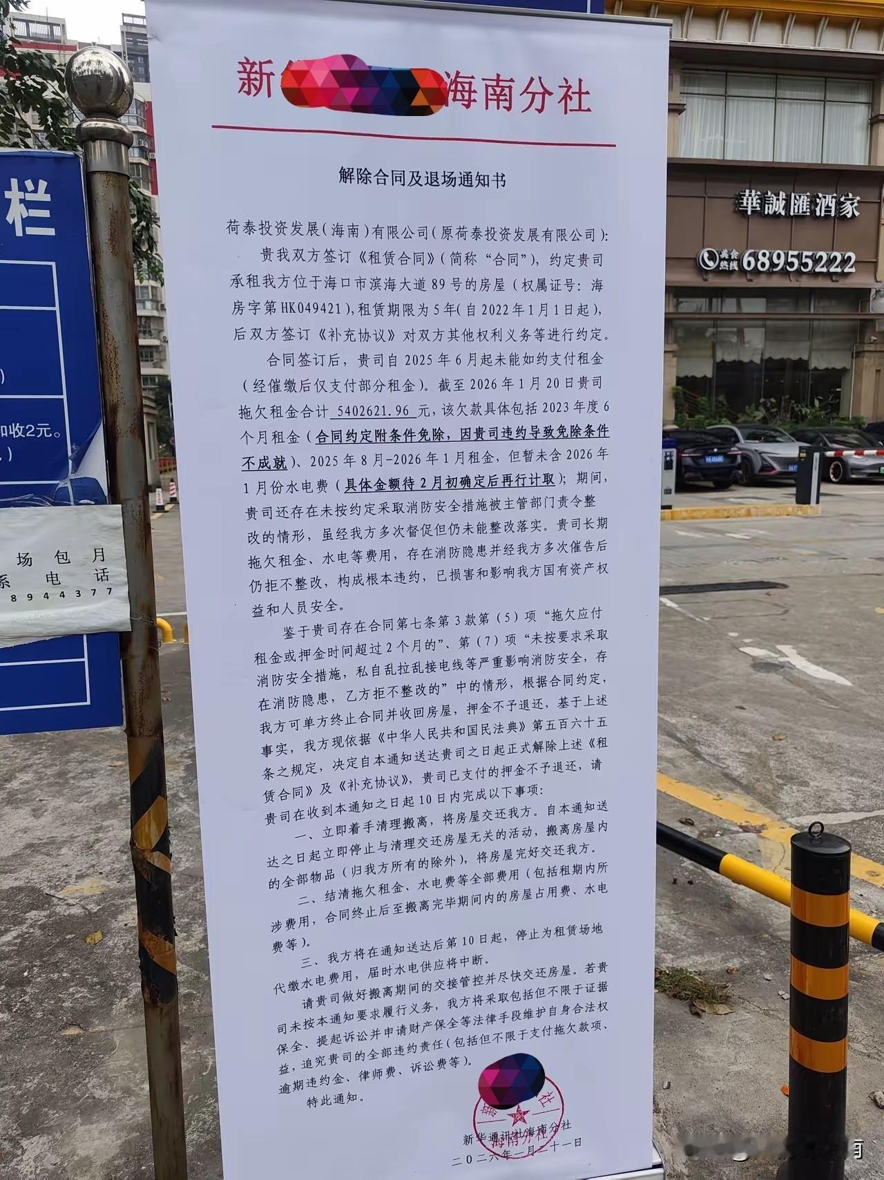 这家酒店在海口也算是一家有些年头和名气的老店了,业主这都把要求退场及追账的公告怼到了门口,可见得已经是忍无可忍了。双方撕破脸,信任已然缺失,闹到这地步,是是非非,最后只能是对簿公堂了。酒店背负欠债的不好名声,不光面子难看,这生意眼下恐怕是也无法持续下去了。 年关到了,欠账的该把欠账结了,做生意不能不讲诚信,不能辜负了别人的信任。再不容易,年底也要把账目清了,高高兴兴干干净净,大家都一身轻的过大年多好啊! 以下图片来源于网友拍摄↓