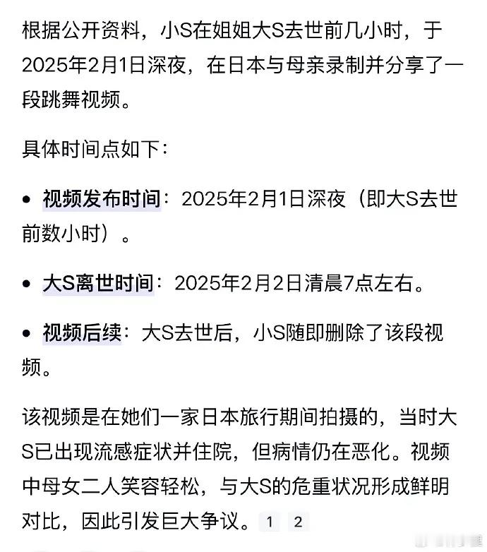 大S抢救 时间线不想阴谋论,但是大s抢救了14小时,而小s和她妈的跳舞视频发布于死前数个钟头,怎么能这样了,我真觉得大s惨。