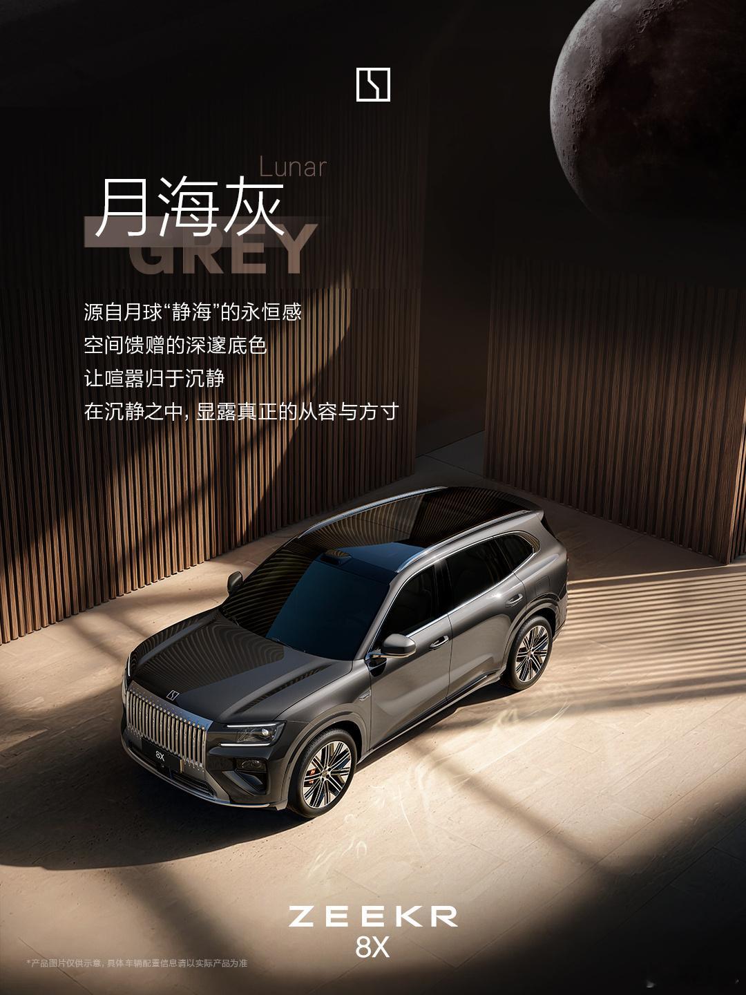 极氪8X 的五种已知外观配色,其中的“月海灰”是它的专属色,灵感来自月球上的静海。