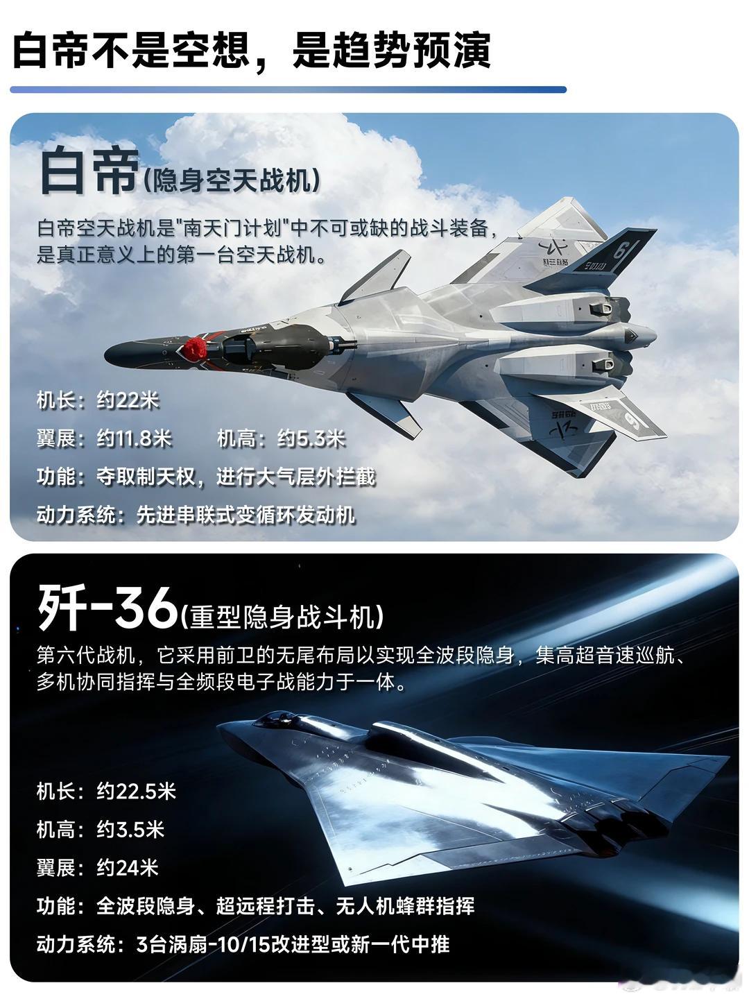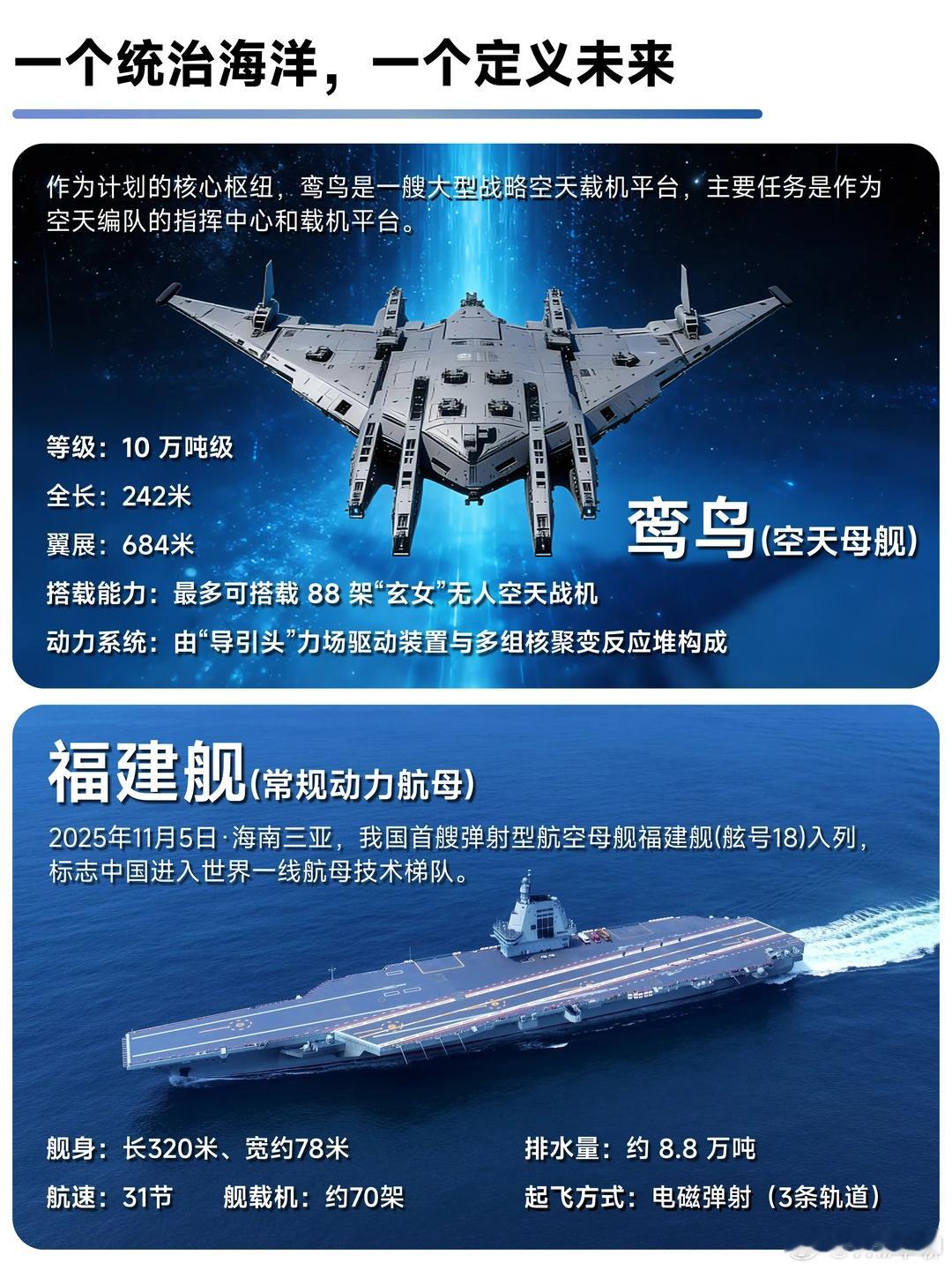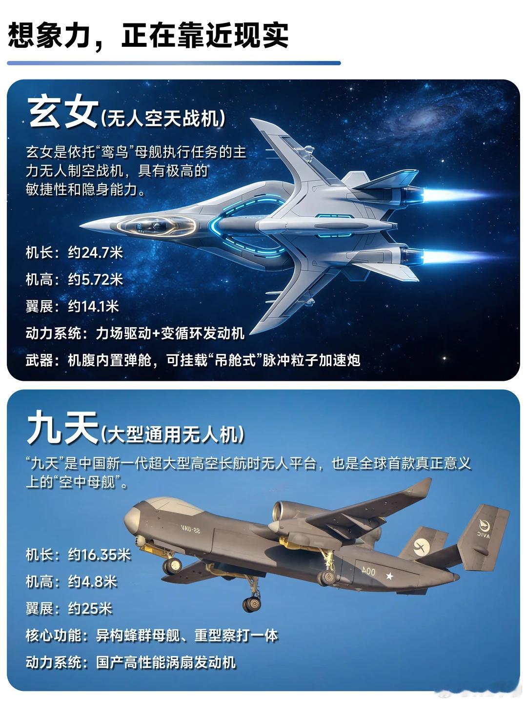 特意做了几个对比图:图一:🔥鸾鸟、玄女、白帝、紫火、承影——这不是单一武器,而是一整套未来作战体系的设想。从空天母舰、无人战机、六代机、重型旋翼机,到单兵机甲,我们离南天门计划还有多远?图二:一个统治海洋,一个定义未来。🌊✈️福建舰代表的是当下中国最顶级的海上作战平台:电磁弹射、完整舰载体系、8 万吨级体量。而“鸾鸟”则把这种“航母思维”直接搬上天空——以空天母舰为核心,构建空中编队与指挥中枢。一个是现实巅峰,一个是未来方向。图三:🛰️玄女是南天门中的无人空天作战核心节点,强调隐身、高速、体系作战;而现实中的“九天”,已经在尺寸、航程、载荷和平台化能力上,接近“空中母平台”的概念。图四:✈️白帝象征的是第六代战机的终极想象:高度隐身、体系指挥、多域作战。而现实中的歼-36,在气动布局、无人协同、信息融合上,正在向这个方向逼近。不是照抄设定,而是技术路线高度重合。图五:🚁紫火代表的是未来武装旋翼平台:高机动、复合任务、立体作战。而直-21作为现实中的重型武装直升机,已经在航程、载荷、防护和火力上完成跃迁。旋翼机,并没有被时代淘汰,而是在进化。图六:这是争议最大、也最有意思的一组对比。🤖承影是未来单兵机甲的设想,而宇树 H2 是现实中的仿生人形机器人。今天它还不能上战场,但在运动控制、能源管理、智能协同这些底层能力上,路线已经清晰。但机甲也不是突然出现的,是一步步“长出来的”。南天门计划不是“预言”,而是一次趋势演绎。当现实装备不断逼近这些设想时,你会发现——未来,并不是一夜降临,而是悄悄兑现。 ✨