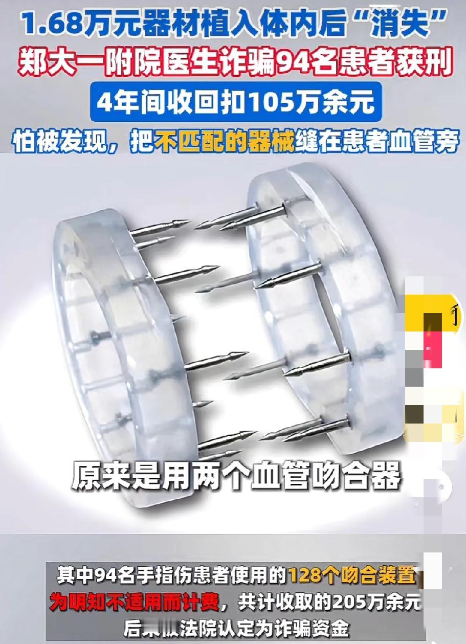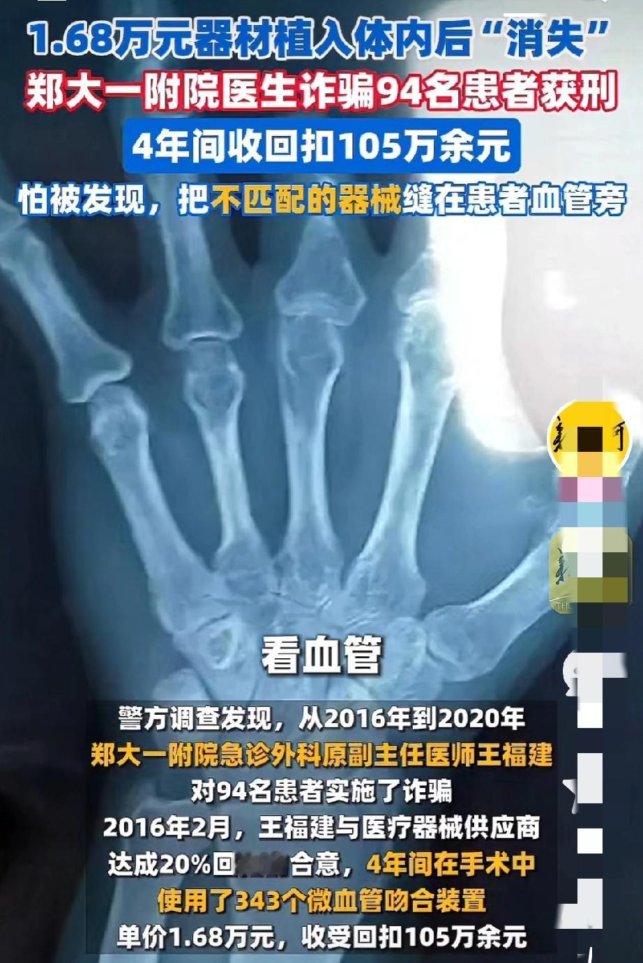 94名患者被坑205万!郑大一附院医生诈骗获刑,高价植入器材不给患者用竟扔进垃圾桶 郑大一附院急诊外科原副主任医师王福建,这名曾完成国内罕见全头皮再植术的名医,竟借着手术刀沦为敛财恶徒,4年间诈骗94名患者、收受回扣105万余元,最终获刑12年,被罚40万元,彻底身败名裂。 2016年2月起,王福建与医疗器械供应商达成协议,每使用一个单价1.68万元的微血管吻合装置,便可抽取20%回扣。明知该装置适配1-4毫米血管,手指血管过细完全不适用,他仍对94名手指创伤患者下手,4年累计计费128个装置,骗取患者205万余元,4年间靠343个装置稳稳收下105万回扣。 患者的惨痛遭遇更是触目惊心:木工王海森电锯断指术后,账单显示2个装置花费3.36万元,3年后拍X光片,体内全无器材踪迹;患者彭先生四指离断手术耗时12小时,被计费6个装置花10.08万元,X光片却无任何器材影像,后来他的助理证实,那些没有用到的器材全被丢进手术室垃圾桶。 面对患者投诉,王福建还升级骗术:初期直接不用计费,被联名投诉后,竟将不适配器材缝在患者血管旁肉里,只为X光片留痕掩人耳目。2018年两次被患者联名投诉,事后他被调至惠济院区,诈骗行径丝毫未停。 2021年12月媒体曝光后,王福建被停职调查,仅8个月就被医院恢复诊疗资格,他却趁机申请提前退休,妄图全身而退。天网恢恢,2023年12月,退休1年半的王福建被刑拘,2025年12月法院终审,以诈骗罪、非国家工作人员受贿罪数罪并罚,判处其有期徒刑12年,追缴全部违法所得,责令退赔患者损失。 一袭白衣,本是救死扶伤的象征;一柄手术刀,本该承载生命重托,可是他却没有丝毫的医者仁心,反而利欲熏心,不顾患者的伤痛与信任,眼里只有金钱的诱惑。在他看来,那些躺在手术台上痛苦不堪的患者,不过是待宰的羔羊,是他获取巨额财富的工具。他用欺骗的手段,将患者的救命钱收入囊中,把本应是神圣的手术室变成了他的敛财之地。 这一事件也提醒着每一位从业者,穿上白大褂,就肩负起了救死扶伤的使命,不能被金钱蒙蔽双眼。要时刻保持敬畏之心,对得起患者的每一份信任,对得起“医者”这一光荣的称呼。