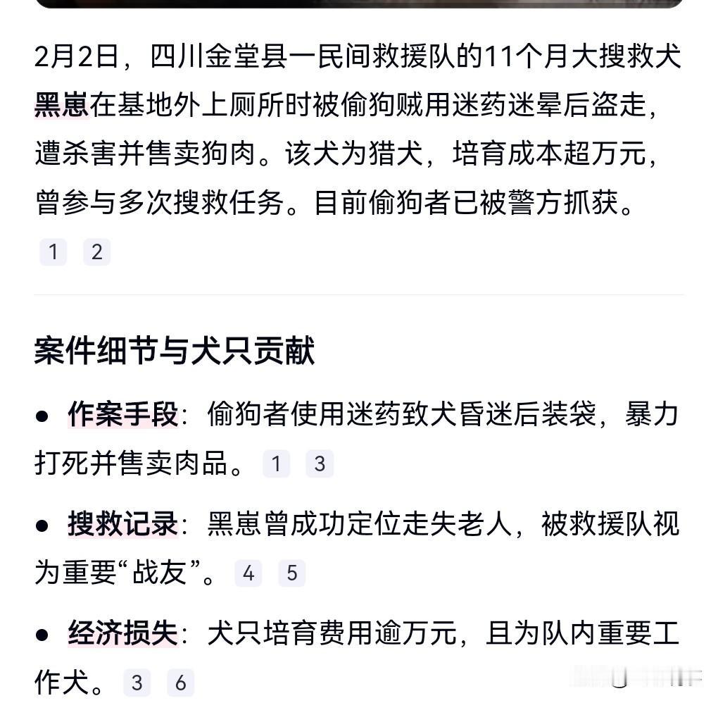 这实在是太恶劣了,这下是踢到铁板了,竟然把救援队的搜救犬盗走杀害售卖。 这实在是太缺德了,这可是搜救犬,是用来救人的。 狗贩子特别的残忍,把狗迷晕后直接打死。 狗贩子那真是特别的可恶,必须严惩,这绝对不是个案。 事发2月2日。 偷狗者已经被抓了。