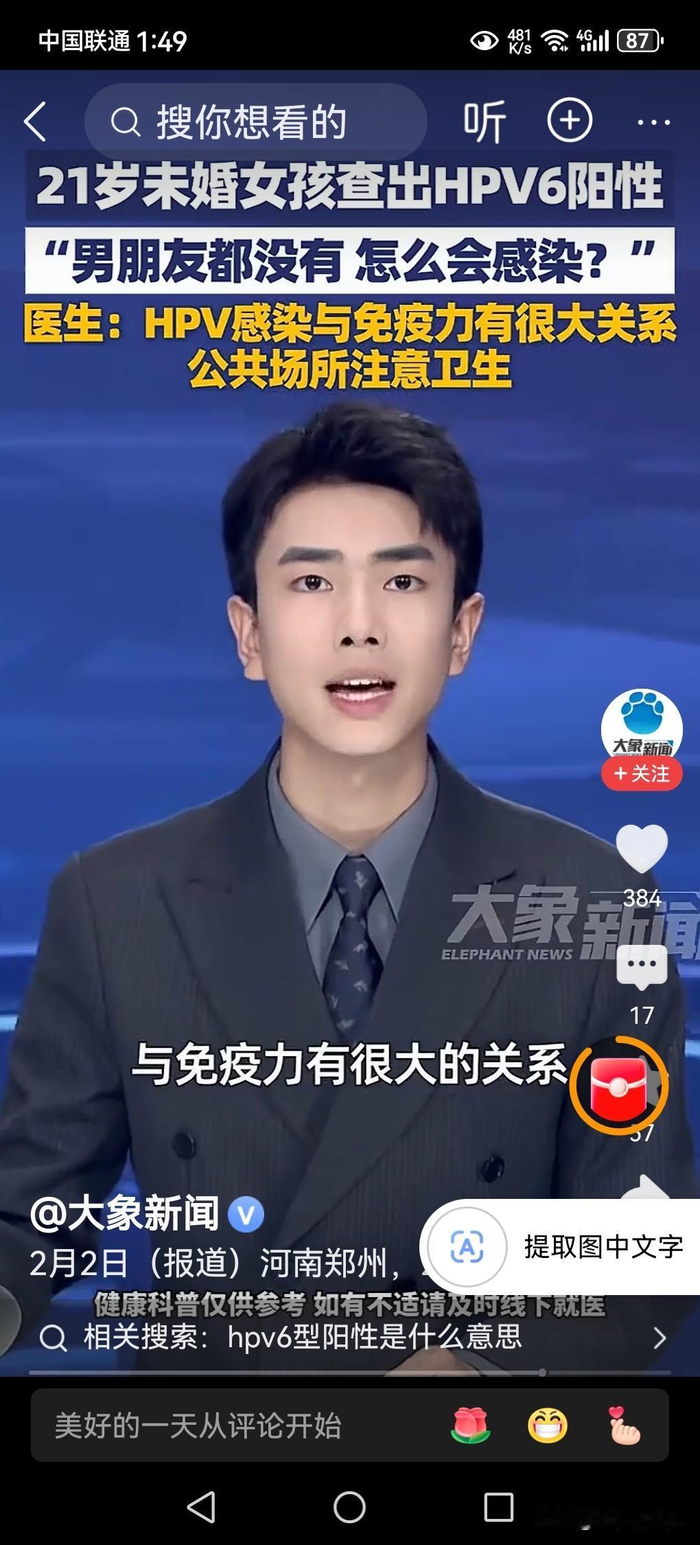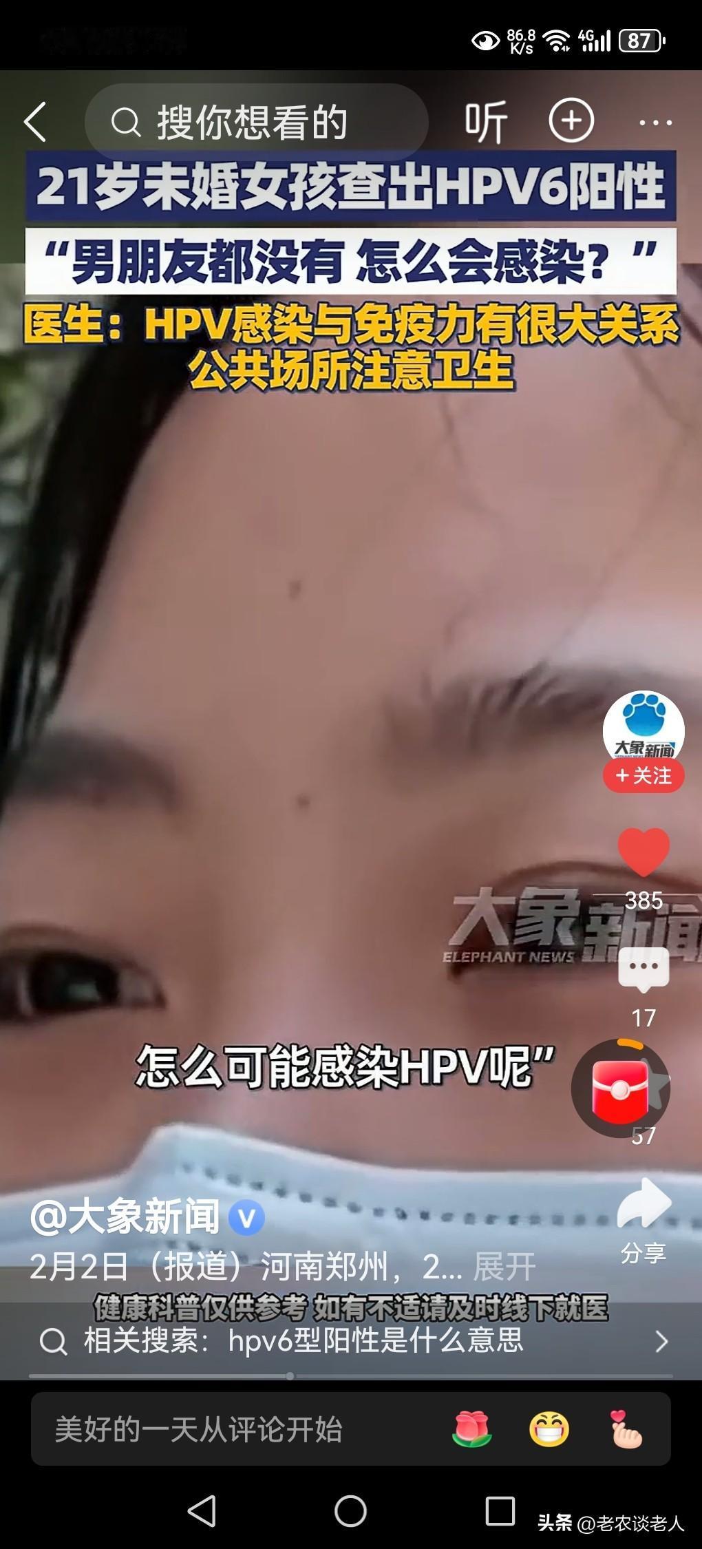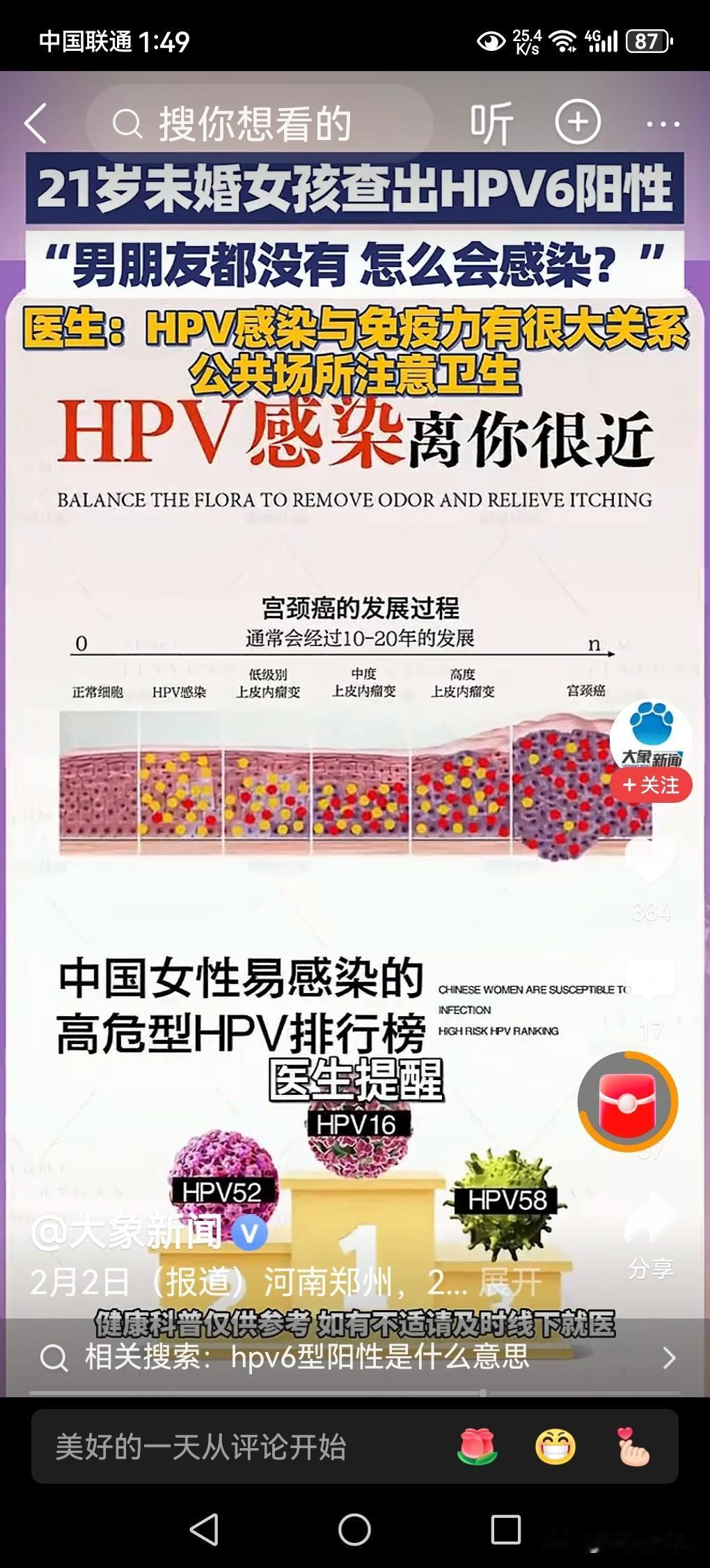 21岁未婚女孩查出HPV6阳性,医生提醒。 什么是HPV6病毒呢? 据资料显示:HPV6型阳性意味着感染了人乳头瘤病毒6型。 何为 HPV?是人乳头瘤病毒,有多种亚型种类,6型是属于低危型。 人感染上了此类型的病毒后,大多数患者没有明显的症状,部分患者会引发良性病变,例如生殖器疣。 大部分人能够依靠自己的身体免疫能力,在1 ~ 2年内清除病毒,少数人会持续感染,需要治疗。 据媒体2月4日报道,河南郑州有一个21岁的未婚小女孩,在医院里检查出hpv6阳性病毒,当时她一下子懞了,不知道自己如何是好,羞愧难当,掩面而哭,这究竟是怎么回事呢? 这位女孩听到此消息以后,当时面如灰色,痛哭流涕,她十分羞愧,不知道究竟什么原因?她对医生表示说,自己今年只有21岁,还没有谈过男朋友,更没有结婚,看到异性小伙子便躲得远远的,怎么会患上这种疾病呢? 医生提醒大家,患上这种HPV病毒感染者,通常有三个途径:一是性接触传播,这是最主要的传播该种病毒的途径;二是密切接触传播,如接触过患者的毛巾、内衣裤等日常生活用品;三是母婴传播,有可能接触过感染该病毒的婴儿。 患上这种病毒的患者也不要着急,可以通过医疗就很快的清除体内的这种病毒,自己身体免疫能力强大的人群,过一段时间会自然的身体将会恢复正常状态。 以上是本人观点,如有不妥,请大家在留言区中留下你宝贵的意见,并积极参与评论。 丰田品质B级纯电家轿9.38万未婚女孩查出HPV6阳性 医生提醒