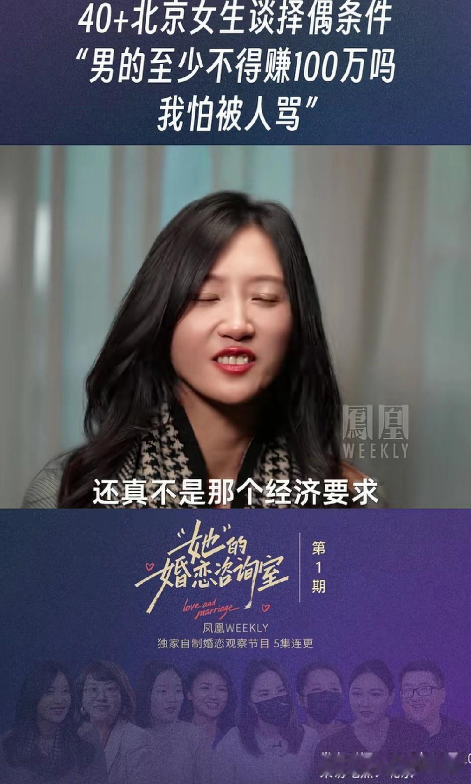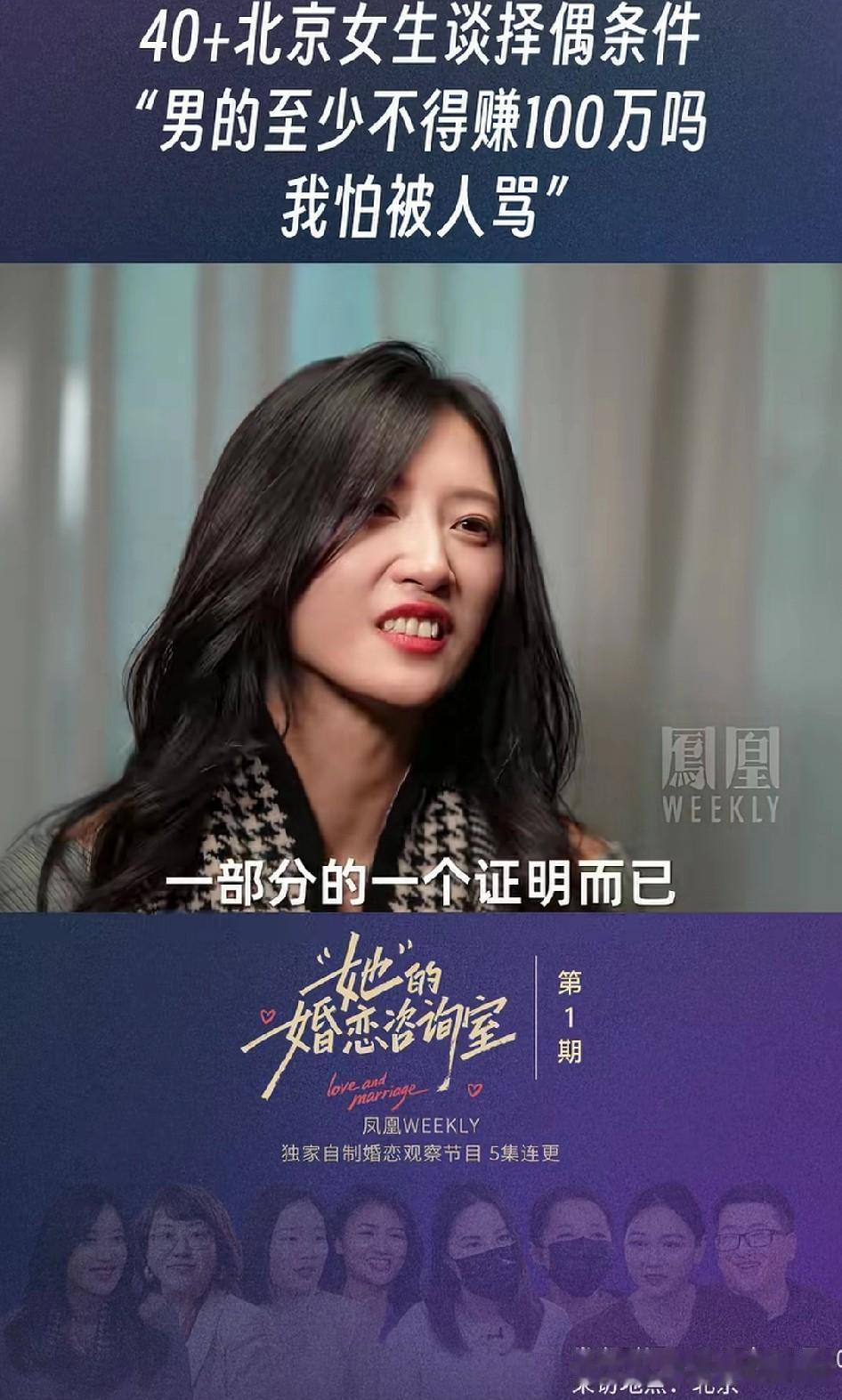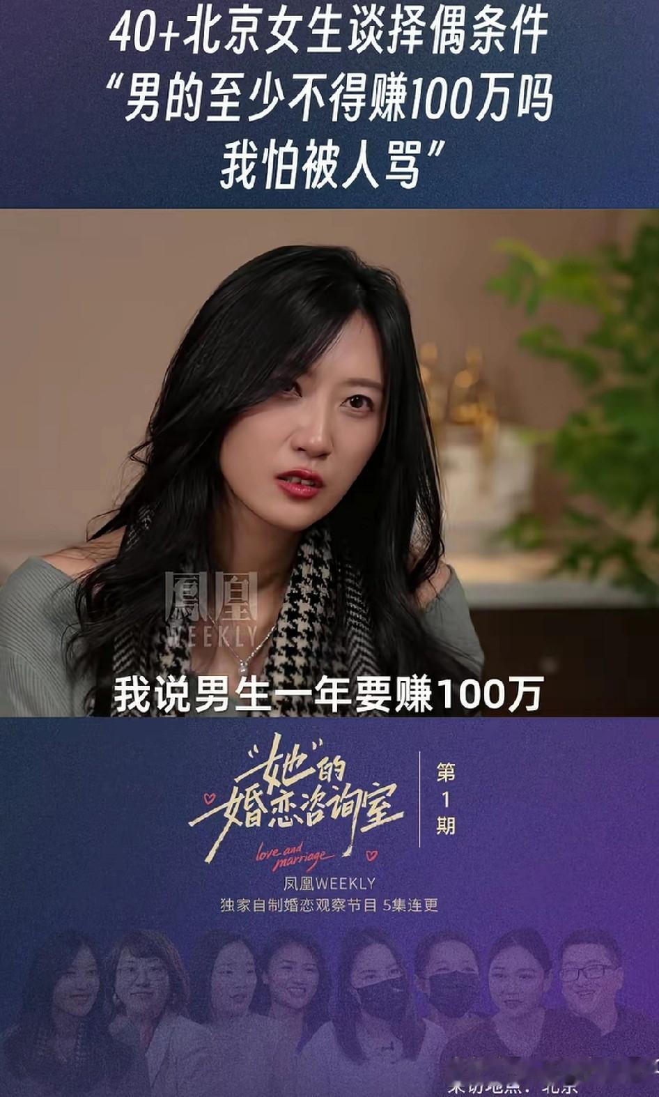 40岁的大龄剩女谈择偶标准:“男方一年最少也要赚100万吧,我怕说的这么直接,可能会被挨骂。” 她进一步补充道,其实自己并不这么看重经济条件,一年挣100万并不是经济方面的要求,这是一个男人综合能力的一个证明而已。 当被问到自己能不能挣这么多时,大龄剩女回答道自己如果能挣100万,那么男方就应该挣1000万了! 有网友评论,确实是这么个道理,这个大龄剩女说的一点儿没错,他要求的一年100万也不多,按照她自身的条件,应该把要求再提高一点,否则明显的吃亏了!