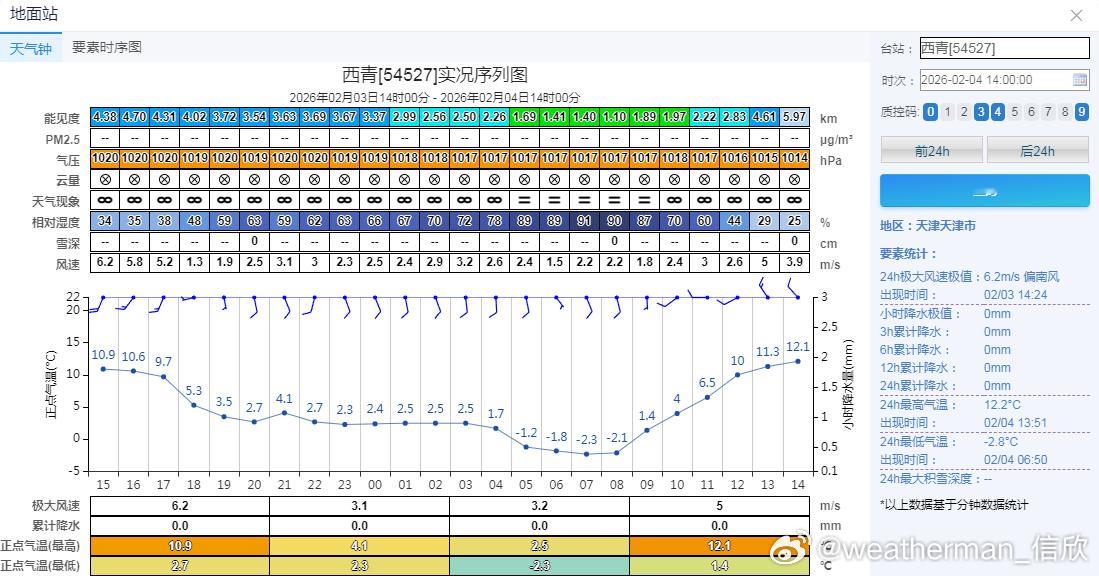 【气温】今天新疆部分地区、云南东部和贵州西部升温明显。新疆阿拉山口升12.1℃、贵州纳雍升11.5℃、云南屏边升10.5℃,为各自省区14时升温最强站点。今天下午,海南云南部分站点超25℃,10℃线推进到了河北北部-北京北部。截至14时最高,北京南郊观象台12.1℃、天津西青12.2℃,均创出今年以来新高。