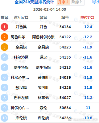 今天因为冷空气影响,内蒙古中东部出现成片降温,包揽14时降温榜前十。其中通辽和赤峰的下属区域降温超10℃,位居降温榜前列:开鲁降12.4℃、阿鲁科尔沁旗降12.2℃、奈曼旗降11.9℃、通辽降11.6℃、翁牛特旗降11.6℃。未来2天,冷空气继续东移南下,东北、华北、黄淮、长江中下游都将出现剧烈降温。