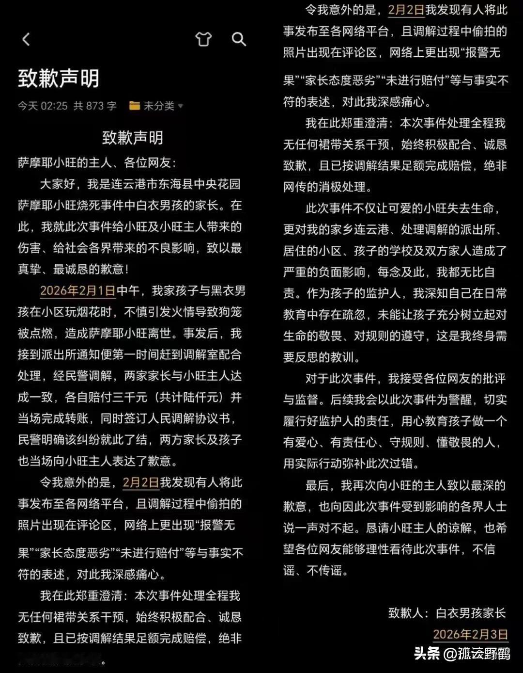 萨摩耶事件大结局!当事人发声: 双方已和解,此事已处理完毕 2月4日,狗主人姜女士发声称: “经律师 和相关部门帮助调解,我与对方已达成 和解,此事已处理完毕。感谢广大网友 的关心!谢谢大家!” 事件起因相信大家都了解了,姜女士将狗养在小区院子里,有人在家就会将狗放出来溜达,没人在家就将狗关在院子里狗笼里,一养就是7年多,这个小区是非常脏乱的,养鸡养兔以及流浪猫都是散养的,事发当天,黑衣男孩在院子里点火玩烟花棒,一开始是拿着点燃的烟花棒去追老母鸡,后来去挑弄关在笼子里的萨摩耶(小旺),最后将烟花棒扔进狗笼里,没多久就起了火。 短短三分钟时间,小旺被烧焦了,姜女士知情后看着监控画面崩溃痛哭。 这段监控视频曝光后,引发广泛网友们热议,评论区舆论两边倒,有网友说: “黑衣男孩为什么要把烟花棒扔进狗笼里,事后着火了也不施救,还有淡定的拿烟花棒去追老母鸡玩!” 也有网友说: “养了7年的萨摩耶,既然感情这么深厚,为什么狗主人要将它养在公共院子里,不能放在家里吗?” 还有网友说: “无论狗养在哪里,都不是烧狗的原因!” 愿小白在另一个世界没有痛苦,也愿这场和解,真的能成为“学会敬畏”的开始。