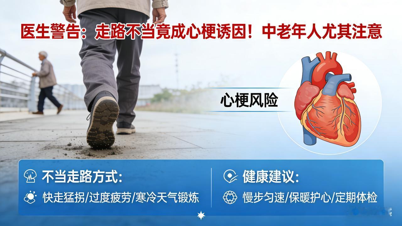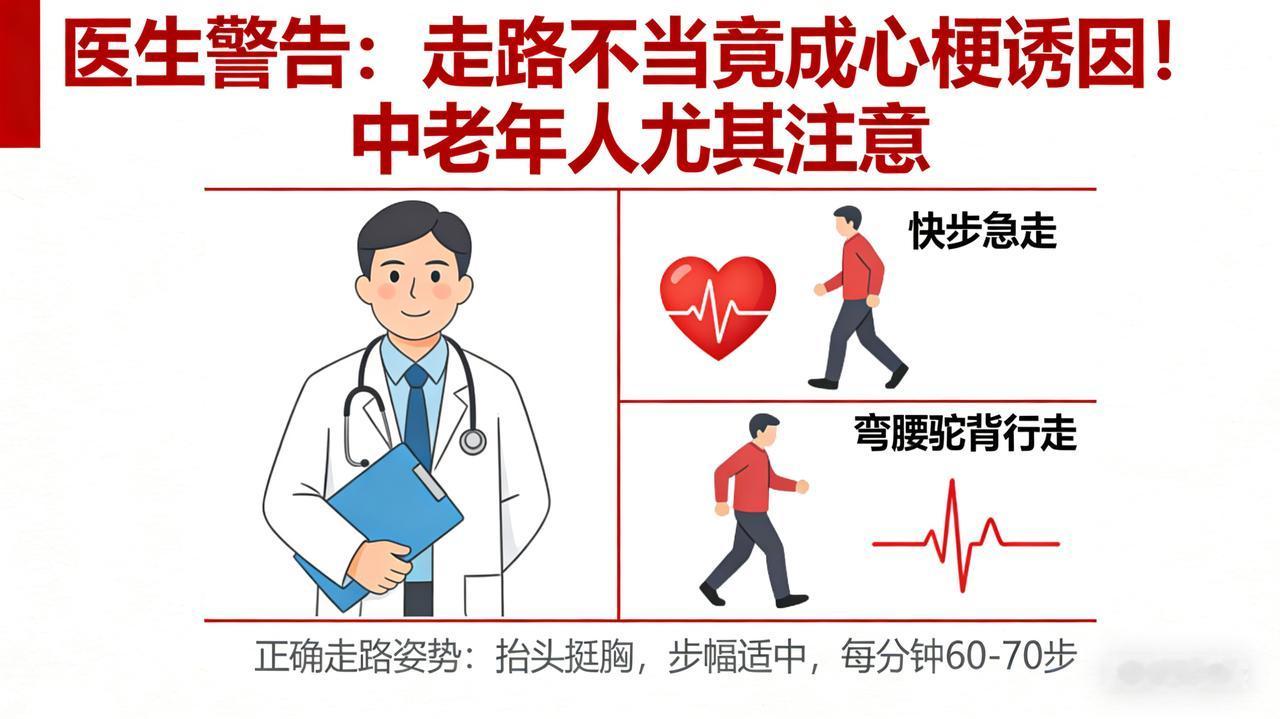 医生警告:走路不当竟成心梗诱因!中老年人尤其注意 心梗是走路走出来的!医生怒吼:心脏就算再好,也经不起这般“暴虐”! 你能想象吗?走路,这个我们每天都在做、看似再平常不过的动作,竟可能成为心梗的“幕后黑手”,将人推向生死边缘!“走路走出了心梗?”这绝非危言耸听,而是血淋淋的现实在发出惨痛警示! 有一位老人,他怀揣着对健康的执着追求,笃信“日行万步,健康永驻”的信条,每天雷打不动地开启长距离快走之旅,无论严寒酷暑,从未有过丝毫懈怠。然而,命运却在他毫无防备之时露出了狰狞的獠牙。某一天,当他如往常一样大步流星地走着,胸口突然传来一阵如刀绞般的钻心刺痛,那疼痛瞬间蔓延至全身,让他几乎站立不稳。他的脸色瞬间变得煞白如纸,豆大的汗珠从额头滚滚而下,整个人仿佛被抽走了所有的力气,瘫倒在地。被紧急送往医院后,医生给出了令人震惊的诊断:过度运动诱发心肌缺血,险些引发致命的心梗!那一刻,老人和他的家人都如遭雷击,怎么也想不明白,原本以为的养生之举,竟成了伤害自己的“凶器”。 心梗,这个令人闻风丧胆的恶魔,其本质是冠状动脉急性闭塞的灾难性后果。多数患者在发病前,冠状动脉早已布满了“定时炸弹”——斑块沉积。走路,这个看似温和的低强度运动,对于心血管系统而言,若方式不当,实则是一场“动态负荷”的残酷暴虐。 清晨,当第一缕寒意还未消散,气温处于一天中的最低谷。此时,人体的血管就像一根敏感的橡皮筋,在寒冷刺激下会骤然收缩,血压也随之如火箭般飙升。倘若贸然出门快走,心脏就如同一个被强行超负荷运转的发动机,需要拼尽全力地工作来维持血液循环,负担瞬间加重数倍。而饭后,本应是身体放松、消化食物的时刻,若立刻起身走路,血液会如潮水般集中流向消化道,心脏的供血就像被截断的河流,变得相对不足。这种情况下,心绞痛就像隐藏在暗处的刺客,随时可能发动致命一击,严重时甚至会引发心梗,让生命在瞬间岌岌可危。 对于心脏功能正常的人群来说,规律且适量的走路确实如同给心脏注入了一股活力源泉,能够增强心肌收缩力、改善血液循环。然而,60岁以上的老年人,身体机能就像一部老旧的机器,逐渐衰退,大多患有冠心病、高血压等基础疾病,血管弹性变得比干枯的树枝还要脆弱。若走路时速度过快、时间过长,心脏耗氧量会如脱缰的野马般突然大幅增加,原本就岌岌可危的血管斑块就可能瞬间破裂,形成血栓,像一颗无情的炸弹堵塞冠状动脉,导致心梗发作,让生命在瞬间陷入绝境。 医生怒吼着发出郑重警告:即便心脏再健康,也经不起这样的折腾!走路时,一定要尽量避开清晨气温最低的时段,选择太阳升起后、气温稍回暖时再出门锻炼,就像给心脏穿上了一层温暖的防护衣;控制好步速,每分钟60 - 80步为宜,时间控制在30 - 40分钟左右,让心脏在适度的运动中得到锻炼而不是摧残;饭后至少休息30 - 60分钟再开始散步,给心脏足够的休息时间。此外,心血管高危人群,如冠心病、糖尿病患者,散步前最好先进行全面体检,随身携带硝酸甘油等急救药品,就像给生命上了一道保险锁,以防意外发生。 走路本是一种简单易行、成本低廉的养生良方,但如果忽视身体发出的信号,盲目追求步数和速度,就如同在悬崖边上疯狂跳舞,反而可能成为心梗的“导火索”,将生命推向万劫不复的深渊。只有科学走路,量力而行,才能真正守护好我们的心脏健康,让生命之花在健康的土壤中绚烂绽放!