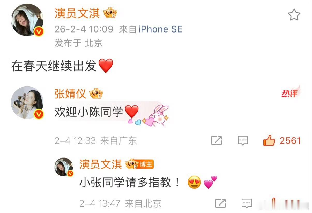 文淇回复张婧仪文淇官宣加入东申未来,张婧仪评论文淇,欢迎小陈同学❤️ 文淇回复张
