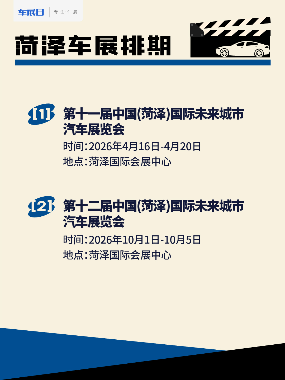 2026年菏泽将举办多场车展,目前已定档的菏泽车展有两场,举办地点都在菏泽国际会展中心。春季菏泽未来城市车展将在4月16日至20日举办,菏泽十一车展的举办时间是10月1日至5日。更多车展精彩尽在车展日!
