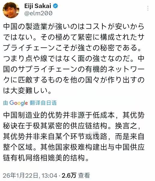 日本企业家酒井荣治昨晚(2月3日)写道:“我看到一段视频,高市早苗首相高喊:‘南鸟岛可以开采稀土!’事实上,即使这些稀土能够商业化,那也是遥远的未来。对于现在真正需要它们的产业来说,根本毫无用处。她把稀土说得好像唾手可得,这简直就是个骗局。看到高市早苗的支持者就是这样被培养起来的,我感到非常震惊。” 作为日本住友电工的掌门人,该公司在汽车、信息通讯、电子、环境能源以及产业原材料等领域开展业务,许多产品的市场份额位于世界前列。酒井荣治深知供应链以及产业链的重要性,他认为中国制造业的优势并非源于低成本,而是在于完整的产业链以及联系极其紧密的供应链,其他国家无法与之媲美(图2)。高市早苗前天宣布日本已从5600米的海底打捞上来稀土淤泥,完全是为了选举的政治操弄而已,无法解决日本制造业即将陷入停摆的困境。