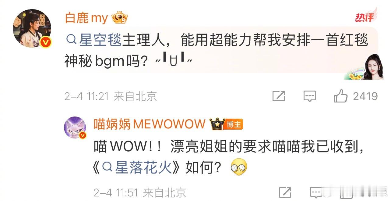 喵娲娲答应帮白鹿安排红毯bgm 白鹿在线喊话星空毯主理人,求超能力安排专属红毯神秘bgm,喵娲娲秒接梗,直接安利《星落花火》,还是姐姐《唐宫奇案》的角色曲!踏星而来的红毯画面已经狠狠脑补了,这波梦幻联动必须蹲住