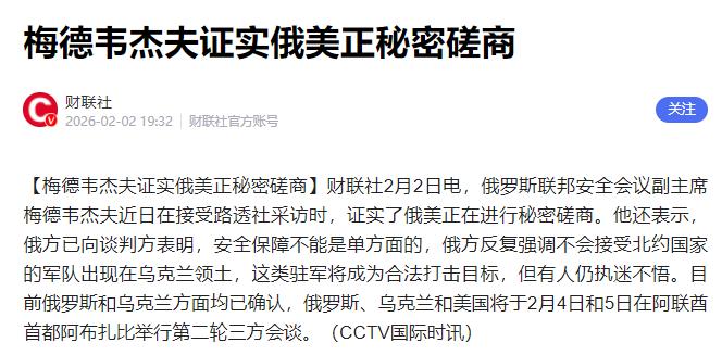 突发消息! 2月2日,俄罗斯重量级人物梅德韦杰夫突然捅破窗户纸,公开承认俄美正在秘密磋商。 毕竟这两年,因为乌克兰那摊子事,俄美关系差到了骨子里,互相制裁、互相警告,你不让我好过,我也不让你省心,对峙了好几年。 俄罗斯人力、物力、财力早就被拖得够呛,2026年的军费都砸到了1660亿美元,占了全国预算的三分之一,只能靠涨税、砍医疗教育福利来填窟窿。 美国那边就更不用说了,自从俄乌冲突爆发到现在,光给乌克兰的援助就砸进去了1750亿美元,国会之前通过了五项相关法案,可现在国内反对的声音都快炸锅了。 再加上美国这边还有一大堆国际烂摊子要收拾,根本没精力一直盯着乌克兰这一个地方,也想赶紧找个台阶下,抽身出来,减少没必要的消耗。 梅德韦杰夫公开承认俄美秘密磋商,绝对不是一件简单的事,背后全是两大国的利益博弈。 核心就是要解决核军控和乌克兰这两个迫在眉睫的问题,这可不是说俩国要和好如初、握手言和了,毕竟对峙了这么多年,积怨太深,不可能一下子就化解。 俩国现在之所以愿意坐下来偷偷谈,只是因为双方都意识到,长期耗下去,只会两败俱伤,谁都捞不到好处。 还不如通过私下谈判,试探一下对方的底线,找一个双方都能接受的平衡点,别让局势再继续恶化下去。 还有一件事比乌克兰问题还关键,关乎全世界的安全,那就是核军控条约的事。 俄美之间现在就剩一个核军控条约了,2010年签的,2011年正式生效,本来就管10年,后来又延长了5年,眼瞅着就到今年2月5号到期了,根本耽误不起。 俄罗斯这边早就亮明了态度,希望能再延长一年,普京之前也说过,只要美国不搞小动作、不破坏现有平衡,就算条约到期了,俄罗斯一年内也会守着条约的核心规矩。 可美国那边的态度就一直模模糊糊,特朗普之前就随口放话,说“到期了就到期了”,还吹牛皮说自己能谈成一个更好的新协议。 可到现在,连一句具体的说法、一个可行的方案都没拿出来,纯属放空炮。 而且大家别小看这个条约,它不只是让俩国少造点核武器那么简单,里面还有每年18次的现场核查、专门的双边委员会协商这些关键机制。 一旦这条约失效,俩国就没了约束,很可能会无限制地发展核武器,引发新的军备竞赛,到时候,全世界都得跟着提心吊胆。 所以这次秘密磋商,谈这个条约的延期,绝对是重中之重,比乌克兰问题还紧急。 大国之间的博弈,说到底,都是为了自己的国家利益,但不管怎么争、怎么闹,和平才是所有人都希望看到的结果。 毕竟战争到最后,受苦的不是那些高高在上的政客,而是普通老百姓,不管是俄罗斯的老百姓,还是乌克兰的老百姓,都盼着能安安稳稳过日子,远离战争的痛苦。