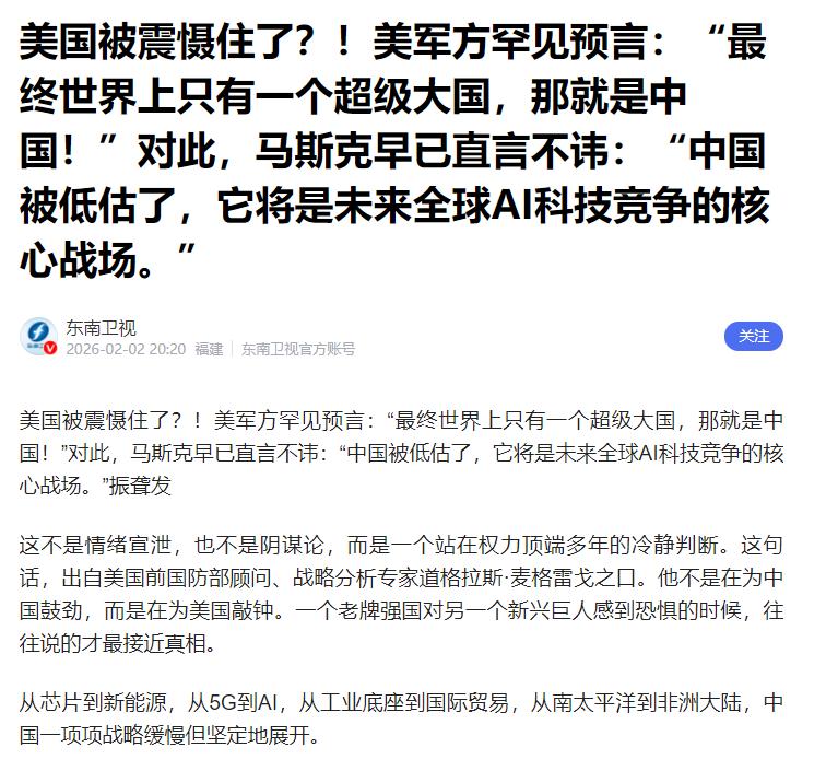 美国被震慑住了?据媒体2月2日报道,美军方曾罕见预言:“最终世界上只有一个超级大国,那就是中国!”对此,马斯克早已直言不讳:“中国被低估了,它将是未来全球AI科技竞争的核心战场。” 这句话,出自美国前国防部顾问、战略分析专家道格拉斯·麦格雷戈之口。先跟大家说清楚,麦格雷戈不是普通人,他在美军方干了很多年,专门研究大国之间的较量。 他说的这话,不是随口乱说,也不是讨好中国,更不是瞎编的阴谋论,就是站在美国的角度,冷静看着中国发展后,得出的实在判断。 他说这话,不是帮中国说好话,而是提醒美国,中国发展太快了,再不清醒,美国的霸权地位就保不住了。 可能有人会问,一个美国专家,为啥会看好中国?其实答案很简单,看实实在在的情况就知道,不是他偏心,是中国进步太明显,只要客观看,谁都能发现。 先说经济,中国是全世界造东西最多的国家,已经连续15年了,全世界近三分之一的东西都是中国造的。 小到家电、衣服、手机,大到桥梁、高铁、航母,我们都能自己造,质量也越来越高。而且我们和全世界大多数国家都做生意,很多国家都离不开中国的产品。 反观美国,欠的钱已经超过35万亿美元,制造业越来越差,经济增长也慢,还总搞贸易限制,最后自己的老百姓多花钱,企业也受影响。 再看军事,麦格雷戈最清楚中美军事的差距。美国虽然有11艘航母,但很多都老了,经常要维修,搞军事项目还特别费钱,还总出故障。 而中国的军费都花在实用的地方,现在已经有四艘航母,舰艇数量超过400艘,战斗力越来越强。 美国在全世界有800多个军事基地,花钱又费力,而我们只专注于自己防御,不搞扩张,效率更高。 科技方面,马斯克也说过,中国被低估了,未来全球AI竞争,中国会是核心。 这话没错,我们的5G基站全世界最多,华为也造出了自己的芯片,打破了美国的限制,AI技术也用到了我们平时的支付、语音助手上,科技实力越来越强。 另外,我们的“一带一路”帮很多国家建路修港,影响力越来越大,而美国的盟友越来越不听它的,国内问题也一大堆,政府停摆、两党争斗,社会也不太平。 其实,麦格雷戈和马斯克的话,都是对中国发展的实在判断。美国之所以觉得被震慑,不是中国要威胁它,而是中国发展太快,综合实力越来越强,动摇了它的霸权地位。 一个老牌强国,看到新兴的中国稳步崛起,难免会焦虑,这时候说的话,往往最真实。 我们不用骄傲,中国发展不是为了取代谁、争霸权,就是为了让老百姓过好日子,所有成就都是中国人辛辛苦苦换来的。 美国的教训也告诉我们,靠霸权、打压别人走不远,只有自己努力、和各国好好相处,才能长久发展。