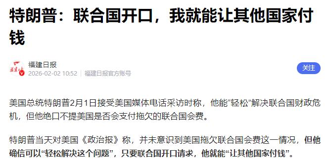 2月2日,古特雷斯“喜从天降”,因为特朗普要帮联合国“要债”了,特朗普说:我会让所有人尽快付清联合国的欠款,就像我让北约国家付清欠款那样。”但对美国是否会支付拖欠联合国的费用,特朗普则拒绝回答。 1月30号那天,古特雷斯急得跟热锅上的蚂蚁似的,一天之内发了两次警告。 先是给各国驻联合国的代表写了封信,说联合国正面临迫在眉睫的财政崩溃,要是再凑不齐钱,7月份之前资金就彻底耗尽了。 紧接着又公开发表声明,敦促各国赶紧交会费,别再拖着了。 现在联合国已经开始精打细算过日子了,计划裁掉2600多个岗位,预算也得压缩15%,说白了就是能省则省,连员工的日常办公开支都得抠着来。 联合国的会费有个明确的规矩,就是按“支付能力”来算。 简单说就是,国家经济实力越强,交的钱就越多,还会根据各国的人均收入、外债情况,给穷国减点负担,这规则其实挺公平合理的。 在所有国家里,美国作为世界第一强国,交的比例也是最高的,常规预算要扛22%,维和预算更要扛28%,按理说,它本该是联合国最靠谱的“金主爸爸”,结果呢? 却是最能欠账的那个“老赖”。 根据最新的消息,现在各国欠联合国的会费加起来有15.7亿美元,创下了历史新高,而这里面,美国一个国家就欠了差不多15亿。 大家可以算笔账,剩下所有国家加起来才7000万,几乎就是美国一家拖垮了联合国的财政。 而且美国欠账也不是一天两天了,从特朗普上次当总统的时候起,就几乎停止交联合国会费了,2024年的钱至今没结清,2025、2026年的更是连影子都没见着。 美国真的没钱交吗?压根不是,它一年的军费就有7000多亿美元,欠联合国的这点钱,还不及它军费的一个零头。 说白了,它就是故意拖着,把会费当成施压联合国的工具,想让联合国跟着它的指挥棒走,这可是专家们早就点透的事儿。 就在联合国快撑不住的时候,特朗普突然冒出来刷存在感了。但稍微琢磨琢磨,就知道这全是空话,根本不靠谱。 最大的欠账户就是美国,就算其他国家都把钱交清了,就美国这15亿拖着,联合国的财政危机还是解决不了,纯属治标不治本。 说白了,他这么做,就是为了自己的政治竞选。现在他正忙着造势,要是能塑造一个“有能力、能搞定国际难题”的形象,就能捞到不少支持率。 帮联合国要债,听起来多有面子,多有影响力,既能讨好国际社会,又能在国内树威信。 说到底,联合国的财政危机,根儿就在美国身上。只要美国不主动把欠的钱交了,不承担自己该承担的责任,就算有再多的人出来帮着要债,也没用。 联合国是全世界的联合国,不是美国一个国家的工具,它要想真正渡过难关,还是得靠各个国家都守规矩,按时缴纳会费。 美国作为最大的出资国,应该起到带头作用,一边拖着不交,一边装模作样地帮别人要债,这种自相矛盾的做法,迟早会失去自己在国际社会上的公信力。
