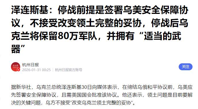 泽连斯基拒绝任何妥协! 泽连斯基声称,要想乌克兰停火,首先美国必须同意为乌克兰提供安全保证,其次俄罗斯必须接受乌克兰的条件,即乌克兰拒绝任何领土让步。 打了四年的仗,乌克兰整个国家都被拖得支离破碎,俄军现在已经实际控制了乌克兰大约18%的领土,前线的局势已经严峻到了极点。 全国现在没有一座完好无损的发电站,电力系统损失了超过60%的发电能力,今年冬天基辅气温降到零下15度,好多老百姓家里连暖气都没有。 2026年乌克兰的国家预算有450亿美元的赤字,全得靠美国和欧盟的援助才能填补,通胀高到离谱,好多人丢了工作,要么流离失所,要么被困在战火里,连一口热饭都未必能吃上。 最要命的是军队,乌军的总伤亡已经接近百万人,能正常投入作战的兵力越来越少,缺口大到补不上。 为了凑够兵源,乌克兰的征兵标准一降再降,到现在几乎是“能走路就得上”,以前受法律保护不用参军的医生、教师、IT工程师,现在都成了征兵重点。 都惨到这份上了,泽连斯基咋还死咬着不妥协,非要跟俄罗斯硬扛到底? 其实这两个看似没得谈的条件,全是他权衡来权衡去的无奈选择,每一条都牵着乌克兰的生死存亡,也牵着他自己的政治前途。 要是他敢在领土上松口,国内老百姓得骂他卖国贼,军队也不会服他,他的总统位置肯定坐不稳,以后也别想在政治上立足了。 乌克兰能撑到现在,全靠美国和欧洲的援助,尤其是美国,自冲突爆发以来已经给了超过640亿美元的援助,不管是武器、资金还是情报,哪一样都离不开美国。 要是现在跟俄罗斯妥协,美国大概率会直接断了援助,甚至减少援助,到时候乌克兰没了后盾,别说保住领土,能不能保住国家的独立性都不好说。 泽连斯基其实也怕,再这么耗下去,乌克兰可能真的扛不住了,经济濒临崩溃,人力、物力都快耗光了,可他没有更好的选择。 要是现在妥协,丢了领土,又没有美国的安全保证,乌克兰以后只会更被动,会被俄罗斯一步步挤压,最后可能连国家的独立性都保不住。 所以他其实是在赌,赌美国不会真的放弃他,赌西方盟友会一直支持他,毕竟美国一直把乌克兰当成制衡俄罗斯的棋子,按理说不会轻易让乌克兰倒下。 他之所以一直坚持不妥协,就是想用这种方式,倒逼美国尽快给出明确的安全保证,也倒逼俄罗斯在领土问题上松口。 泽连斯基拒不妥协,是结合了乌克兰的实际惨状、国内民意、美国和欧盟的态度,还有自己的政治前途,综合权衡后的选择。 现在的局面就是,美国态度摇摆不定,两党在援乌问题上吵得不可开交;俄罗斯寸步不让,领土要求没有任何商量余地;泽连斯基夹在中间,只能硬着头皮坚持,进退两难。 这场博弈,看似是泽连斯基和俄罗斯的对抗,本质上就是美国和俄罗斯的地缘政治较量,泽连斯基不过是这场博弈里最关键的一颗棋子,他的选择,很多时候都由不得自己。 不管最后结果怎么样,最受苦的还是乌克兰的老百姓,他们承受着战争带来的所有伤痛,流离失所、无家可归,忍受着寒冷和饥饿,这才是战争最残酷的地方。