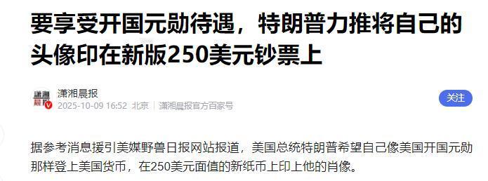 美国历史上第一位二百五总统即将诞生,就是当今美国总统特朗普! 特朗普竟要求把自己的肖像印在250美元钞票上,这事听着都离谱,真把自大刻到骨子里了! 这事从根上就不合美国自己的规矩,甚至还违背了一百多年来的法律。 最先跳出来提议这事的,还不是特朗普自己,是他所在的共和党议员,为了拍他马屁,特意找了些“表彰他重振美国”的借口。 而特朗普呢,立马就表态支持,在自己的社交账号上转发相关内容,半点不掩饰自己的期待。 早在1866年,美国国会就通过了一项法案,写得明明白白:流通中的货币,只能印已经去世的人物肖像,目的就是为了避免个人崇拜,保住货币的严肃性。 当然了,这事背后全是美国政治的那些猫腻,明眼人一看就透。 特朗普马上就要再次上台掌权了,那些共和党议员之所以主动跳出来推动这事,根本不是真觉得他配得上这份“荣誉”,说白了就是趋炎附势、投机取巧。 毕竟等特朗普正式上任,这些议员能不能多捞点好处、多握点权力,全看特朗普的脸色。 哪怕这个想法再离谱、再不合规矩,哪怕会被世人嘲笑,他们也愿意主动推动,把美国政治的功利和虚伪,扒得一干二净,连一点遮羞布都没剩下。 可笑的是,特朗普不光在国内整这些没用的离谱事,在国际上也没少丢美国的人,把傲慢和无知发挥到了极致。 前段时间的达沃斯世界经济论坛上,他带着一身的“美国优越感”走进会场,讥讽加拿大“离了美国就活不下去”;挖苦丹麦二战时六小时就丢了格陵兰,还放话要和丹麦谈判收购格陵兰。 就连中立的瑞士,都被他吐槽“只是靠美国才能勉强过得去”。 他还在演讲里批判欧洲的绿色能源政策,嘲讽风电“低效、丑陋、杀鸟”,甚至威胁要对法国葡萄酒等商品加征100%关税。 而且他这人,最不靠谱的就是说话不算数,自己拍着胸脯许下的承诺,转头就能忘得一干二净。 之前竞选的时候,他信誓旦旦地说,只要上任,就立马公布爱泼斯坦案的相关文件,还说要给大家一个交代。 结果呢,美国司法部前不久公布了超过300万页的爱泼斯坦案相关文件,里面光特朗普的名字就被提到了数百次,可关键内容有几百页都被涂黑,看不清半点实质信息。 说到底,特朗普想把自己的肖像印在250美元钞票上,纯粹就是为了满足自己的虚荣心,彰显自己的权力,把自大发挥到了极致。 大家都知道,现在美国的烂摊子一大堆:通胀问题就没真正解决,鲍威尔说,这主要是关税带来的影响,预计要到2026年年中,关税引发的通胀才会消退。 边境的非法移民问题也一直没解决,大批移民涌入,搞得边境乱成一锅粥。 这些跟老百姓息息相关的实际问题,他半点都不操心、不着急,整天就琢磨着怎么把自己的头像印在钞票上、怎么让自己名留青史,净干些没用又离谱的事。 这场看似热闹的“印钞闹剧”,说到底,就是特朗普的一场自恋表演。既暴露了他自大、自私的真面目,也让全世界看清了美国政治的乱象——功利、虚伪、趋炎附势。 钞票有价,可真正的功绩是无价的;真正能被历史记住的,从来都不是印在纸上的头像,而是为民众做的实事、办的好事。 特朗普这点小心思,到头来大概率也只是一场空,沦为世人茶余饭后的笑谈。
