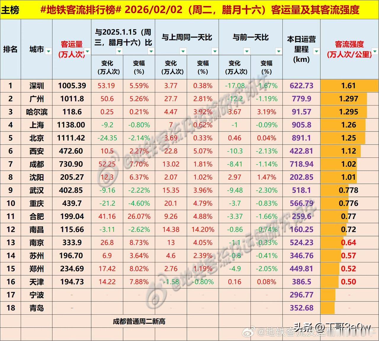 春运以来连续两天广州、深圳地铁客流量超千万人次[呲牙][呲牙][呲牙] 爆料 身边事 客流 中国地铁客流日报 地铁客流排行榜 排行榜 周二 广州 深圳 2026年2月3日 星期② 全国重点城市轨道交通客流量排行榜: 上海:1138.00万 北京:1111.42万北京地铁 广州:1011.80万广州身边事 深圳:1005.39万深圳地铁 成都:730.90万成都身边事 西安:472.60万西安地铁 重庆:439.70万 武汉:402.85万武汉身边事 南京:333.90万南京爆料 郑州:234.69万 沈阳:205.27万沈阳地铁 合肥:199.04万合肥地铁 苏州:196.70万 天津:194.73万天津身边事 青岛:118万+青岛爆料 宁波:118万+宁波地铁 哈尔滨118.60万 南昌:115.66万