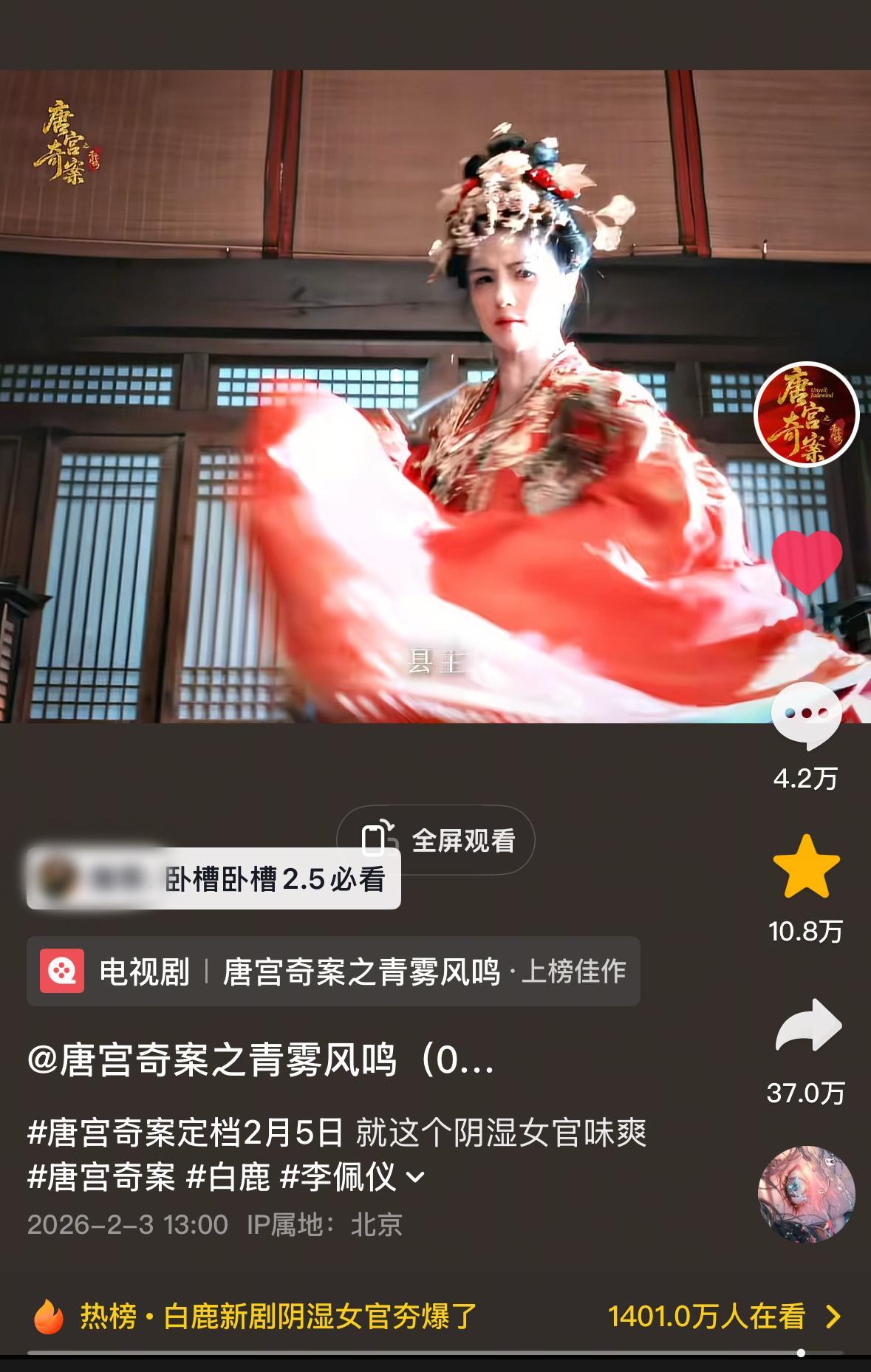 唐宫奇案白鹿李佩仪首个单人🫘百万达成✅就这样对味 狠狠抓住大家眼球的阴湿女官 白鹿实在是太会演了 台词演技都进步超多!有勇有谋的大胆女官李佩仪来也 对自己狠对别人也狠 明日来👖看我们《唐宫奇案》🧐