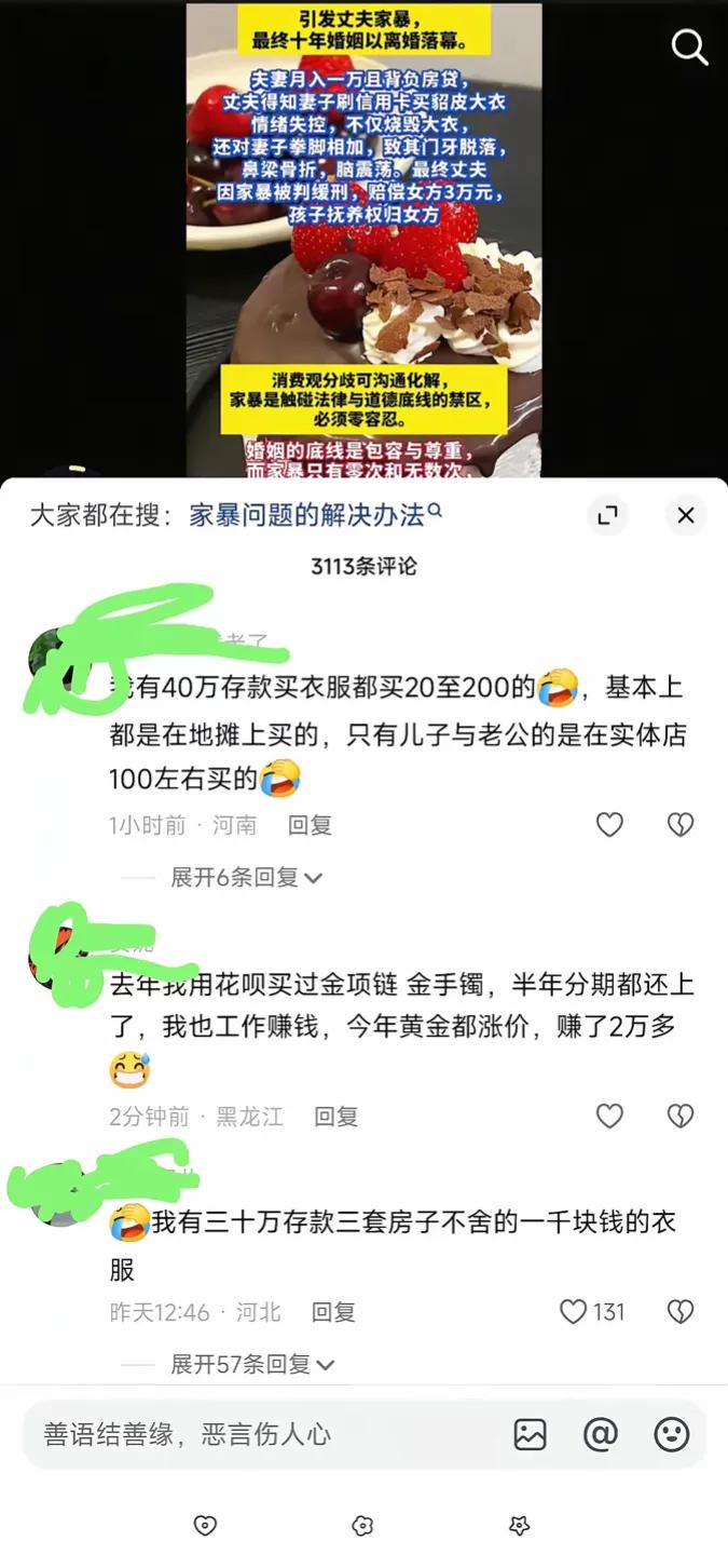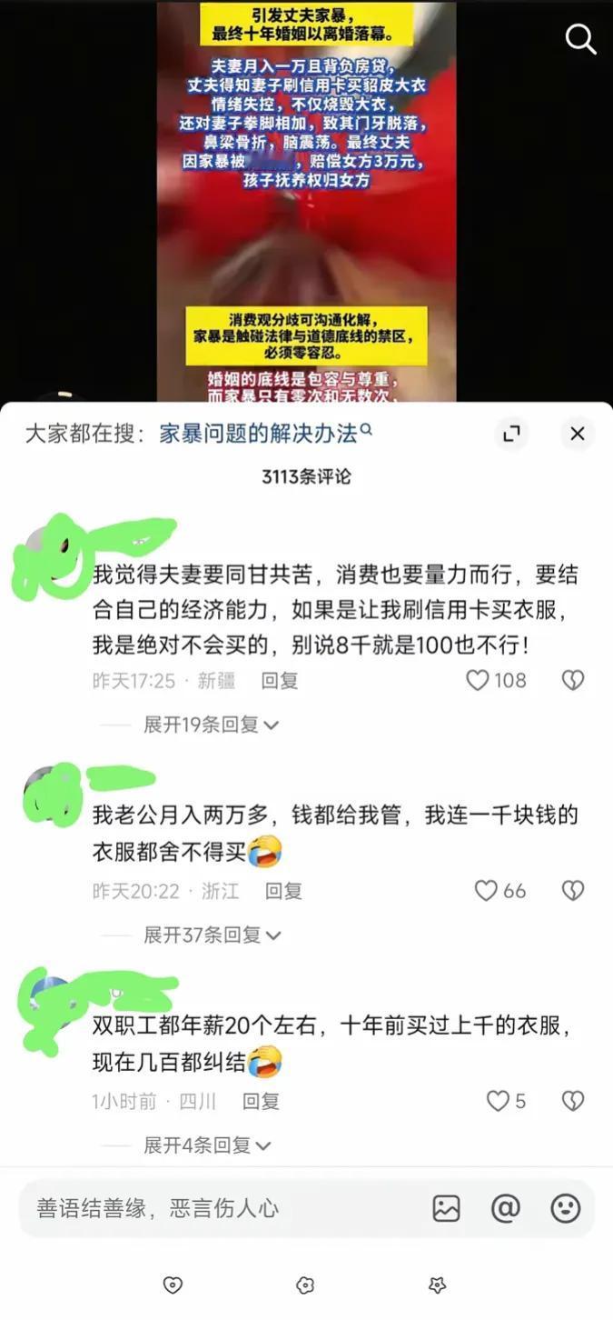 因为妻子刷信用卡买了8000块的貂皮大衣,男子情绪失控,烧了大衣,家暴妻子,致妻子门牙断裂,鼻梁骨折,脑震荡,最后十年婚姻离婚收场。因为这对夫妻经济状况一般,俩人月收入加一起虽然有一万,但有房贷,这个房贷应该不低,所以家庭经济紧张。 对这对夫妻来说,每个月还完房贷,剩下的钱刚够维持日常开销。妻子偷偷刷下的这笔消费,相当于小半个家庭的月收入,成了压垮这段关系的最后一根稻草。丈夫发现后,瞬间被愤怒冲昏了头脑。他不仅点火烧了那件貂皮大衣,还对妻子动了手,拳头和巴掌落在妻子身上,造成了实打实的伤害。 事情闹到了法庭,结局是丈夫因家暴被判缓刑,赔偿妻子3万元,孩子的抚养权也判给了女方。一场冲动的暴力,让他失去了家庭、财产和孩子的陪伴。 网友们在评论区吵翻了天。有人说妻子不懂事,明明家里经济紧张,还非要打肿脸充胖子,买超出承受能力的奢侈品。也有人痛骂丈夫,不管有什么理由,家暴都是绝对不能触碰的底线。更有不少人感慨,消费观的差异,在婚姻里真的能埋下定时炸弹。 这件事里,妻子的行为确实不妥。婚姻里的消费不该是一个人的决定,尤其是大额支出,需要夫妻双方商量着来。但丈夫的反应,显然已经越过了法律和道德的红线。家暴从来都不是“家务事”,而是违法行为。一次动手,就会给受害者留下一辈子的心理阴影,也会让原本可以沟通解决的矛盾,彻底走向无法挽回的结局。 其实,消费观的分歧在很多家庭都存在。有人觉得该省则省,有人认为要及时行乐。真正成熟的夫妻,会坐下来好好沟通,找到双方都能接受的平衡点。而不是像这对夫妻一样,一个偷偷摸摸消费,一个用暴力解决问题。 十年的感情,最终败给了一件貂皮大衣和失控的拳头。 各位读者你们怎么看?欢迎在评论区讨论。
