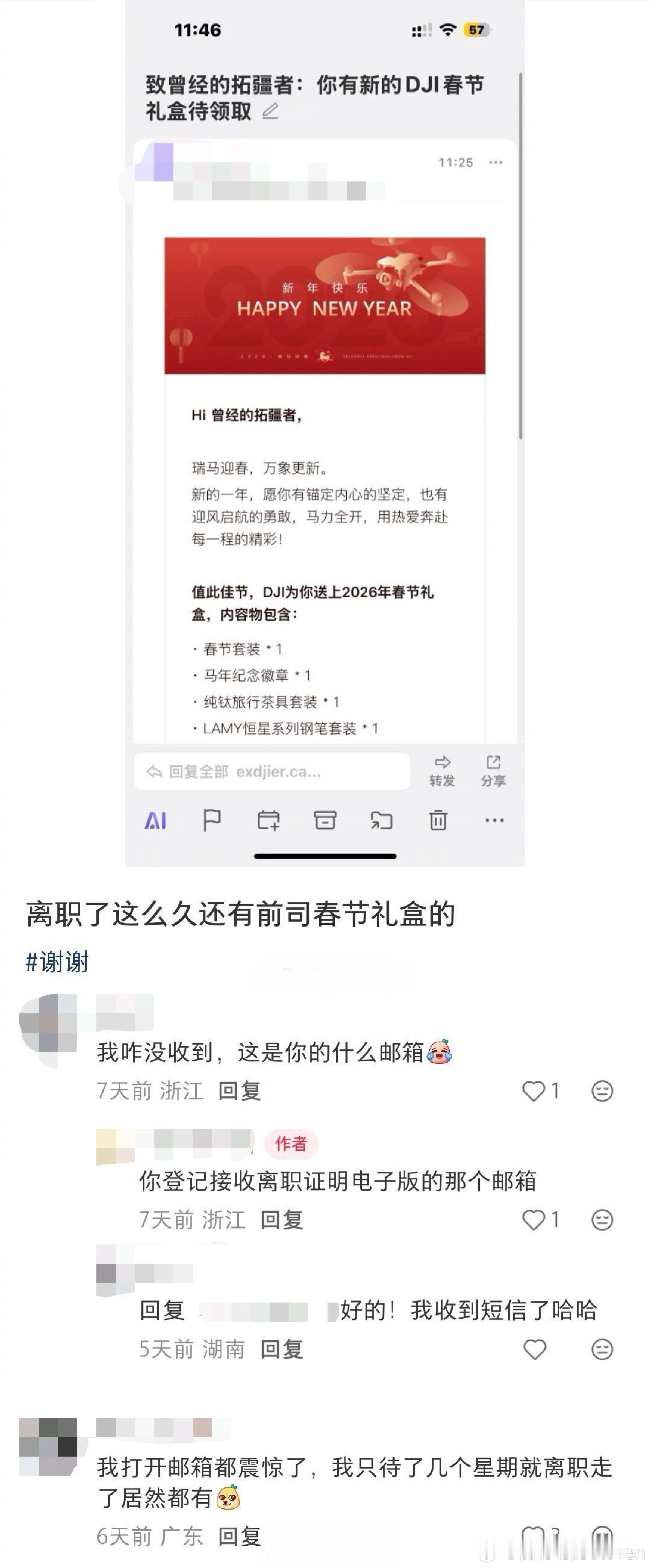 行业龙头公司和行业大公司的区别往往在事上才能看到。大疆为离职未满一年员工寄送与在职员工同款的新春礼盒,这个事其实已经延续几年了。简简单单就打破了“人走茶凉”的职场常态,更重要的是,这份对前员工的善待,也会让在职的员工感受到“付出是会被公司记住的”,有效提高凝聚力。而且估计大疆自己都都没想到,这个“常规”操作会被离职员工帖出来。又是一波口碑积累,中国科技公司的标杆啊。