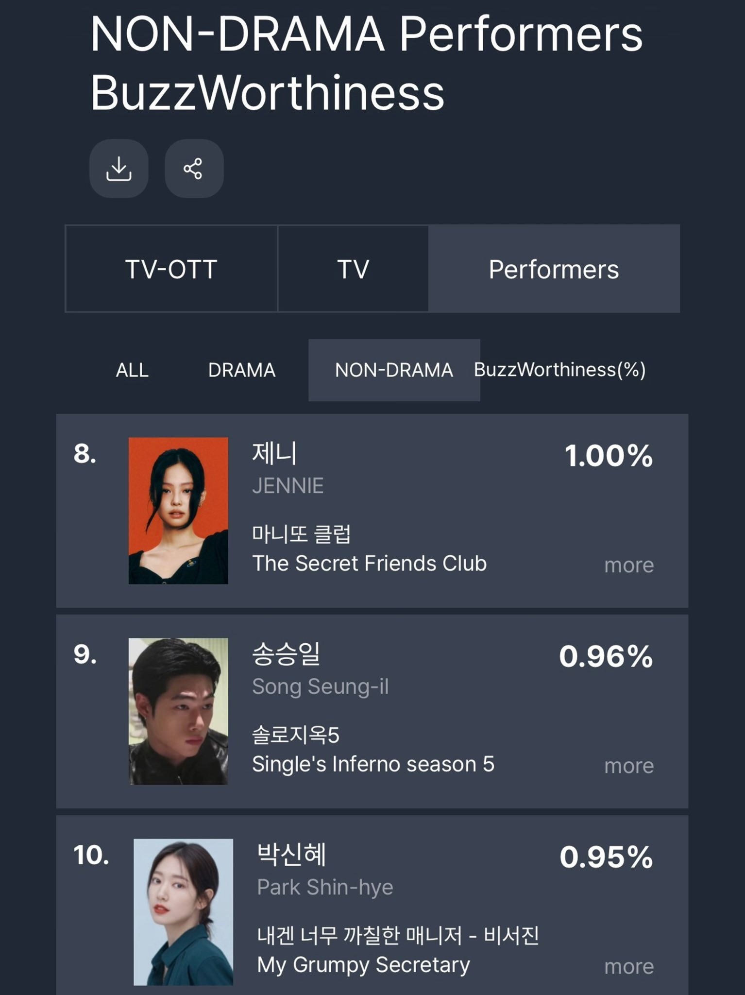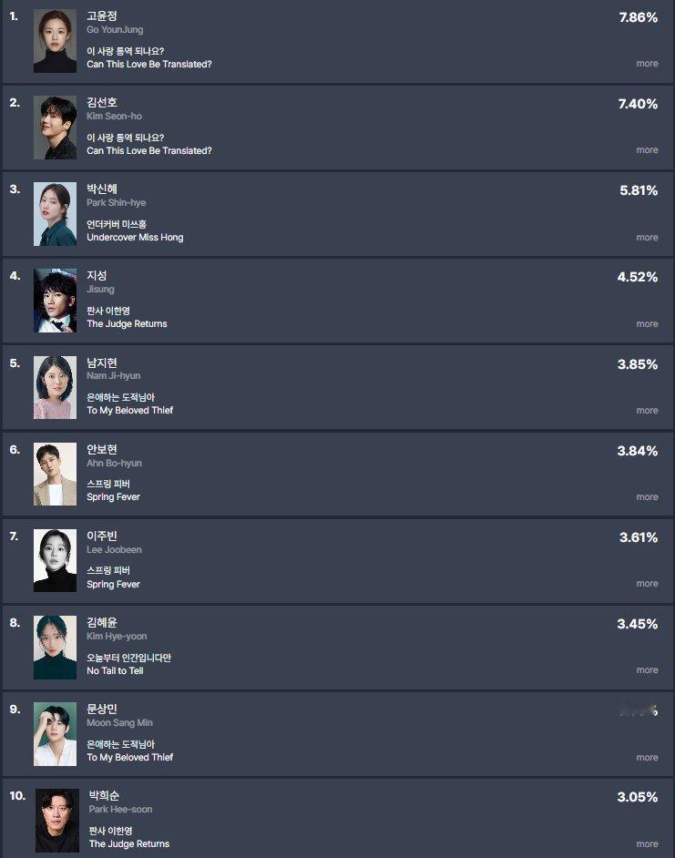 另外作为综艺《秘书镇》嘉宾,朴信惠也进入综艺榜第10位