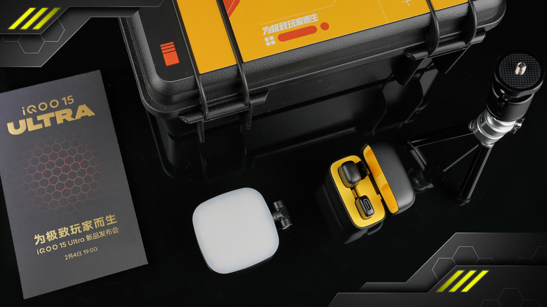 毕竟是性能机里的第一款Ultra,iQOO旗下的首款超大杯,这次的发布会确实很有牌面,连邀请函都非同一般。iQOO放了一个手机直播用的三脚架和手机夹,一个补光灯还有麦克风,看起来寓意很明确:iQOO 15 Ultra在拍摄和直播方面要放开手脚干一番。