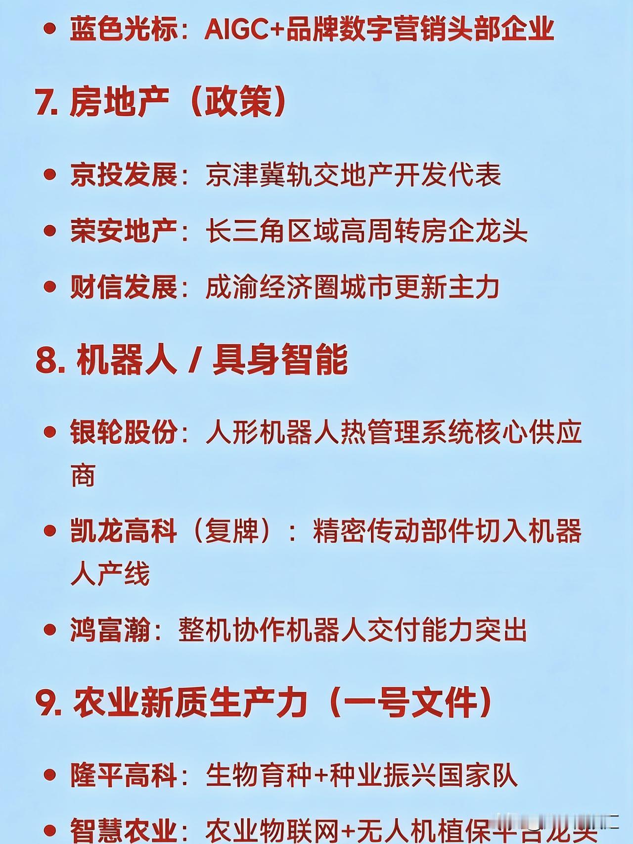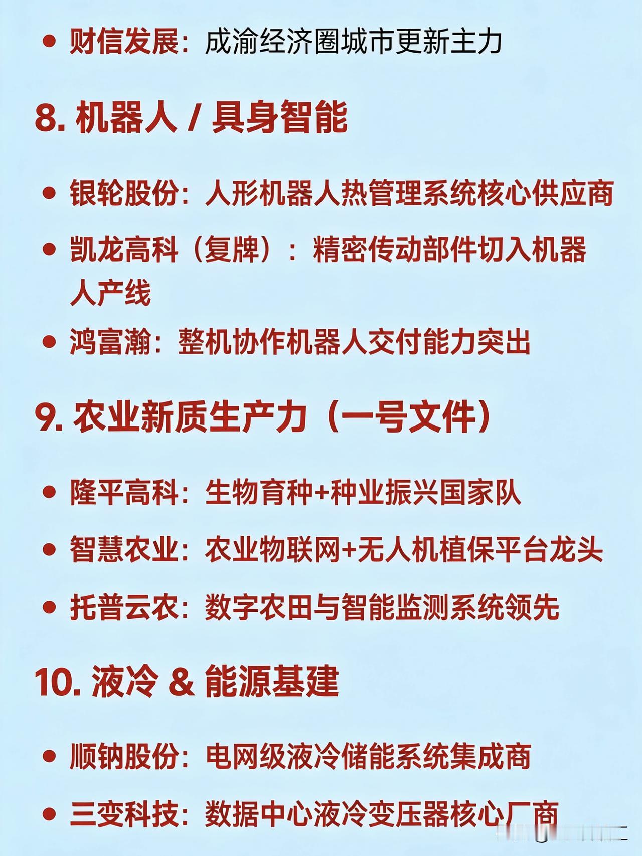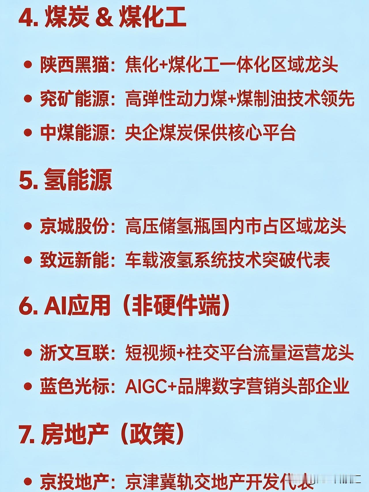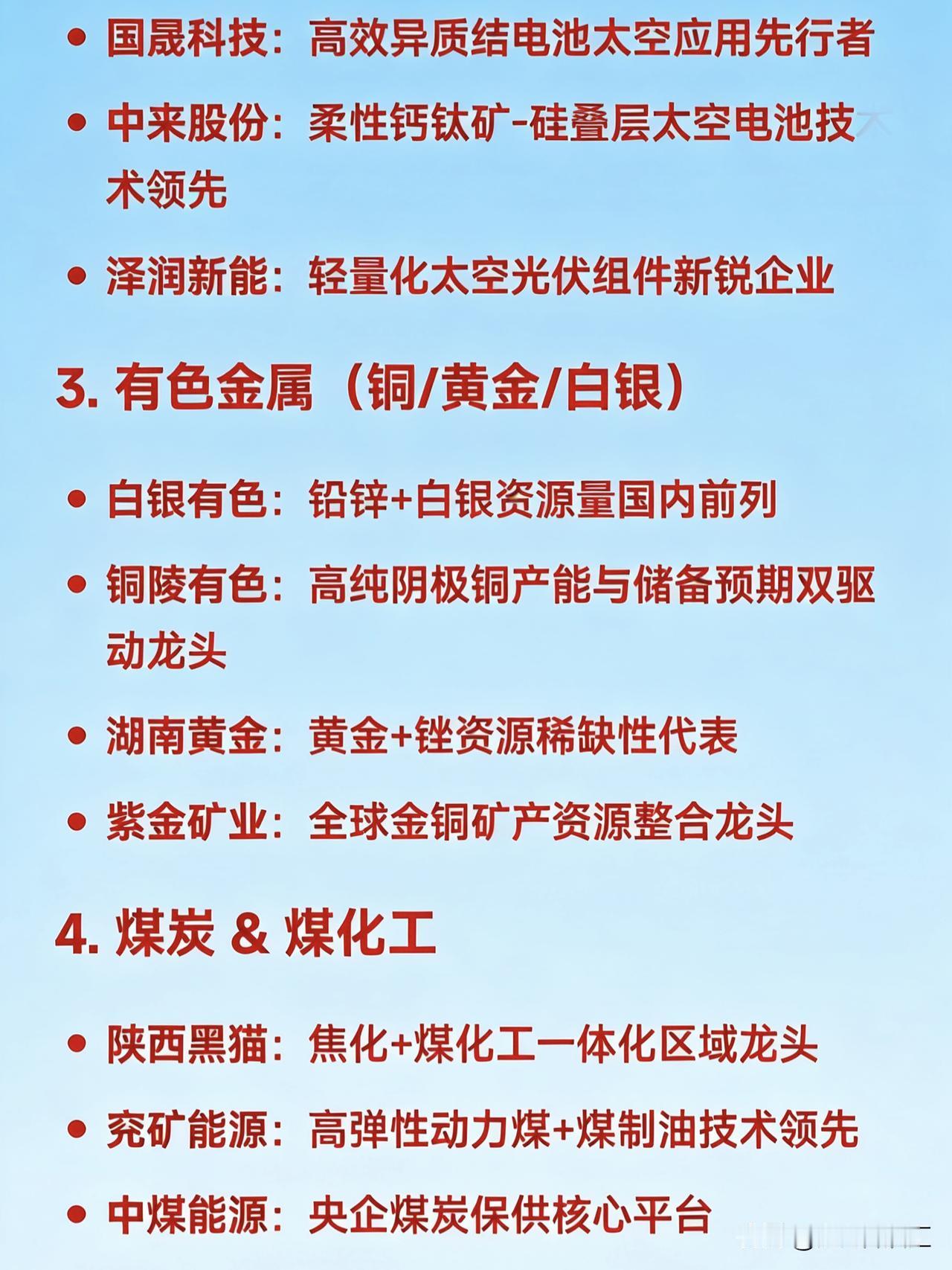 2026年2月4日十大热点科技及其产业链核心龙头 1. 商业航天 航天发展:军工信息化+商业卫星组网龙头 巨力索具:深海系泊+火箭发射支撑系统核心供应商 中超控股:商业航天+大飞机结构件配套龙头 通宇通讯:卫星通信天线领域领先企业 2. 太空光伏 双良节能:HJT/TOPCon太空光伏设备与组件一体化龙头 国晟科技:高效异质结电池太空应用先行者 中来股份:柔性钙钛矿-硅叠层太空电池技术领先 泽润新能:轻量化太空光伏组件新锐企业 3. 有色金属(铜/黄金/白银) 白银有色:铅锌+白银资源量国内前列 铜陵有色:高纯阴极铜产能与储备预期双驱动龙头 湖南黄金:黄金+锑资源稀缺性代表 紫金矿业:全球金铜矿产资源整合龙头 4. 煤炭 & 煤化工 陕西黑猫:焦化+煤化工一体化区域龙头 兖矿能源:高弹性动力煤+煤制油技术领先 中煤能源:央企煤炭保供核心平台 5. 氢能源 京城股份:高压储氢瓶国内市占率领先 致远新能:车载液氢系统技术突破代表 中集集团:氢能装备+可燃冰开发双概念龙头 6. AI应用(非硬件端) 浙文互联:小红书/快手生态营销服务龙头 利欧股份:短视频+社交平台流量运营龙头 蓝色光标:AIGC+品牌数字营销头部企业 7. 房地产(政策) 京投发展:京津冀轨交地产开发代表 荣安地产:长三角区域高周转房企龙头 财信发展:成渝经济圈城市更新主力 8. 机器人 / 具身智能 银轮股份:人形机器人热管理系统核心供应商 凯龙高科(复牌):精密传动部件切入机器人产线 鸿富瀚:整机协作机器人交付能力突出 9. 农业新质生产力(一号文件) 隆平高科:生物育种+种业振兴国家队 智慧农业:农业物联网+无人机植保平台龙头 托普云农:数字农田与智能监测系统领先 10. 液冷 & 能源基建 顺钠股份:电网级液冷储能系统集成商 三变科技:数据中心液冷变压器核心厂商