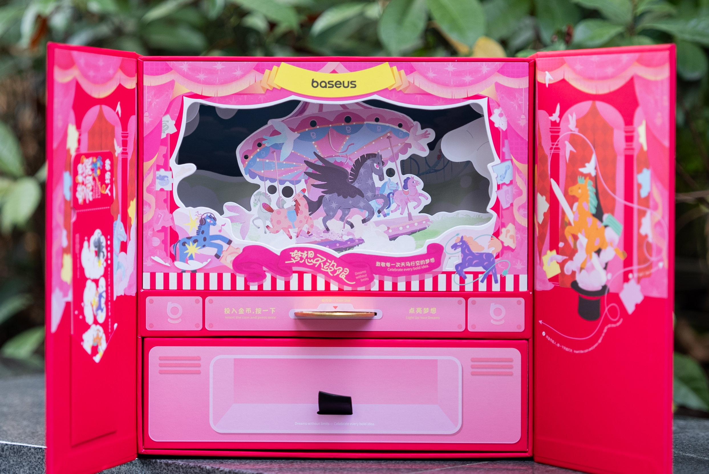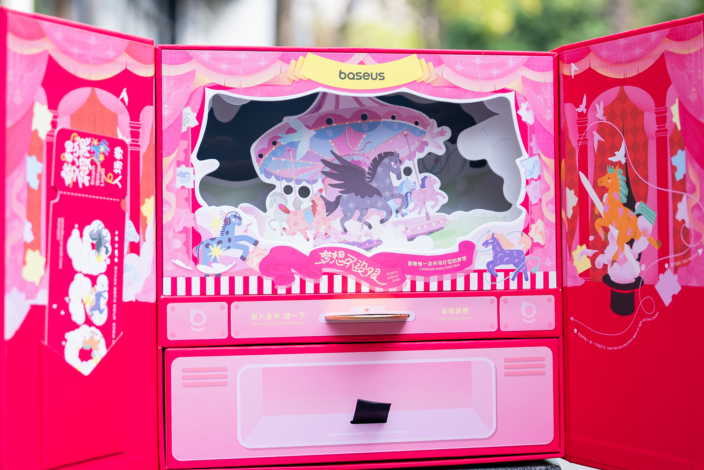 梦想不设限,新年礼盒也要“天马行空”起来~倍思今年的新年礼盒真是创意满满,打开居然是旋转木马音乐盒,不光造型精致漂亮,还能投入马年金币触发机关奏响音乐是谁的少女心被击中了我不说 除了精致的礼盒,倍思还准备了充电宝、蓝牙耳机、红包和冰箱贴 新的一年,我们会跟倍思一起抱有勇气,继续前进哒~