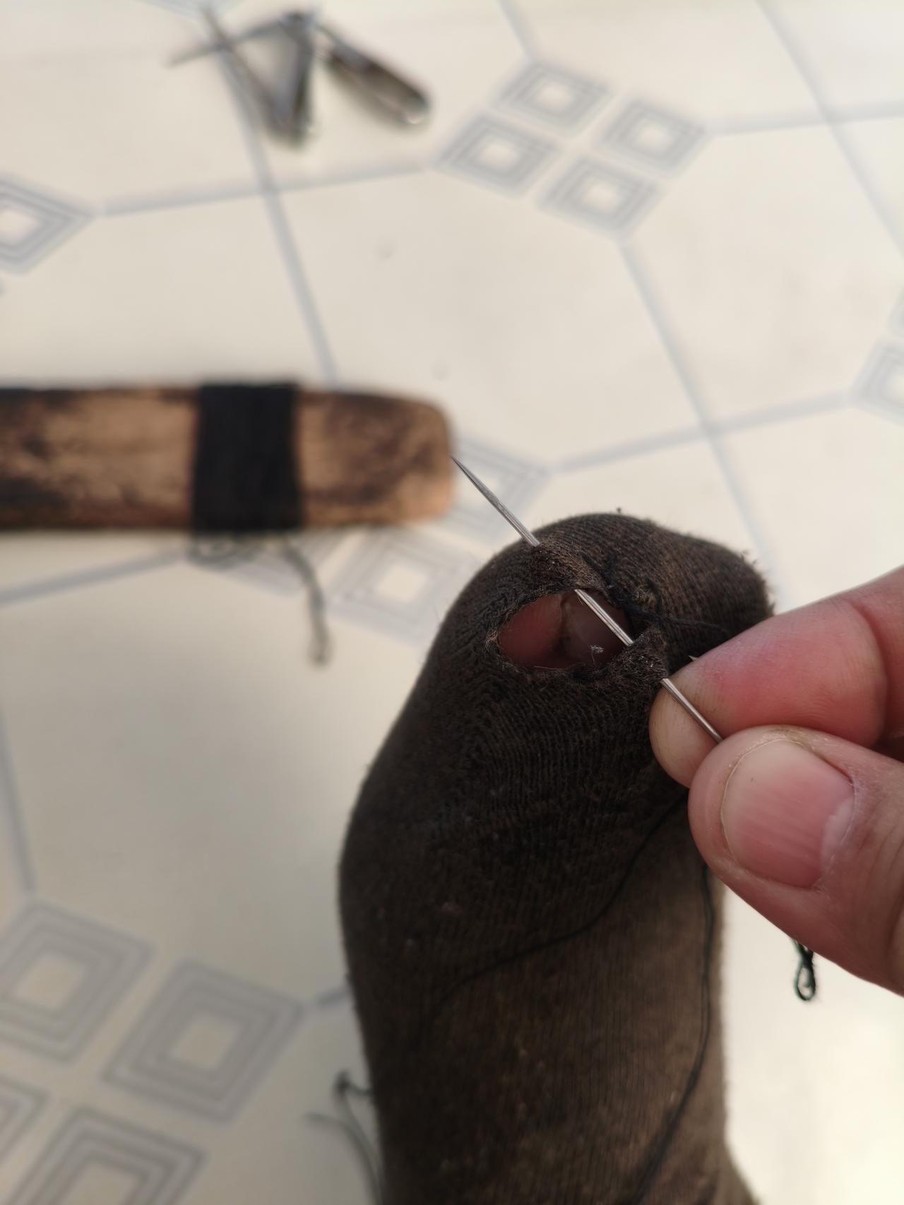 总共十个脚趾头,露出了三个。那我也不舍得扔掉这双袜子,穿针引线,把它缝起来。我节