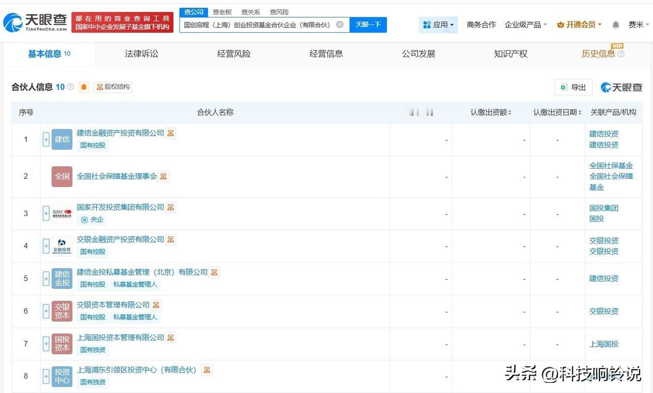 【国投集团等在上海成立创业投资基金 出资额100亿】 天眼查工商信息显示,近日,国创启程(上海)创业投资基金合伙企业(有限合伙)成立,执行事务合伙人为建信金投私募基金管理(北京)有限公司、交银资本管理有限公司、国投创新投资管理有限公司,出资额100亿人民币,经营范围为创业投资,由全国社会保障基金理事会、国家开发投资集团有限公司、交银金融资产投资有限公司等共同出资。 天眼查信息: