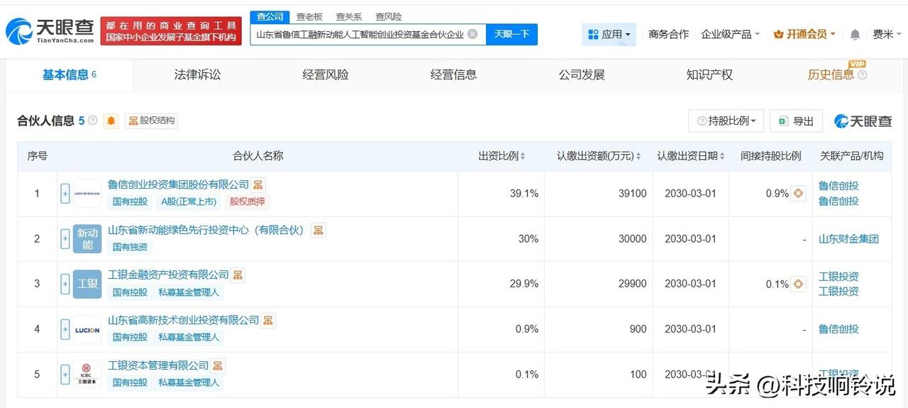 【鲁信创投、工银投资等成立人工智能创业投资基金 出资额10亿】 天眼查App显示,近日,山东省鲁信工融新动能人工智能创业投资基金合伙企业(有限合伙)成立,执行事务合伙人为工银资本管理有限公司、山东省高新技术创业投资有限公司,出资额10亿人民币,经营范围为私募股权投资基金管理、创业投资基金管理服务,由鲁信创投(600783)、山东省新动能绿色先行投资中心(有限合伙)、工银金融资产投资有限公司等共同出资。 天眼查信息: