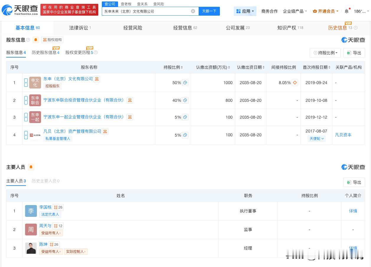 【揭秘文淇新公司东申未来 东申未来由陈坤周迅创立】文淇加入东申未来 2月4日,文淇官宣加入由陈坤、周迅、舒淇共同创立的经纪公司“東申未来”。 天眼查工商信息显示,東申未来关联东申未来(北京)文化有限公司成立于2017年6月,法定代表人为李国栋,陈坤任经理,注册资本2000万人民币,经营范围包括从事文化经纪业务、演出经纪等。股东信息显示,该公司由东申(北京)文化有限公司、宁波东申联合投资管理合伙企业(有限合伙)等共同持股。 天眼查信息:
