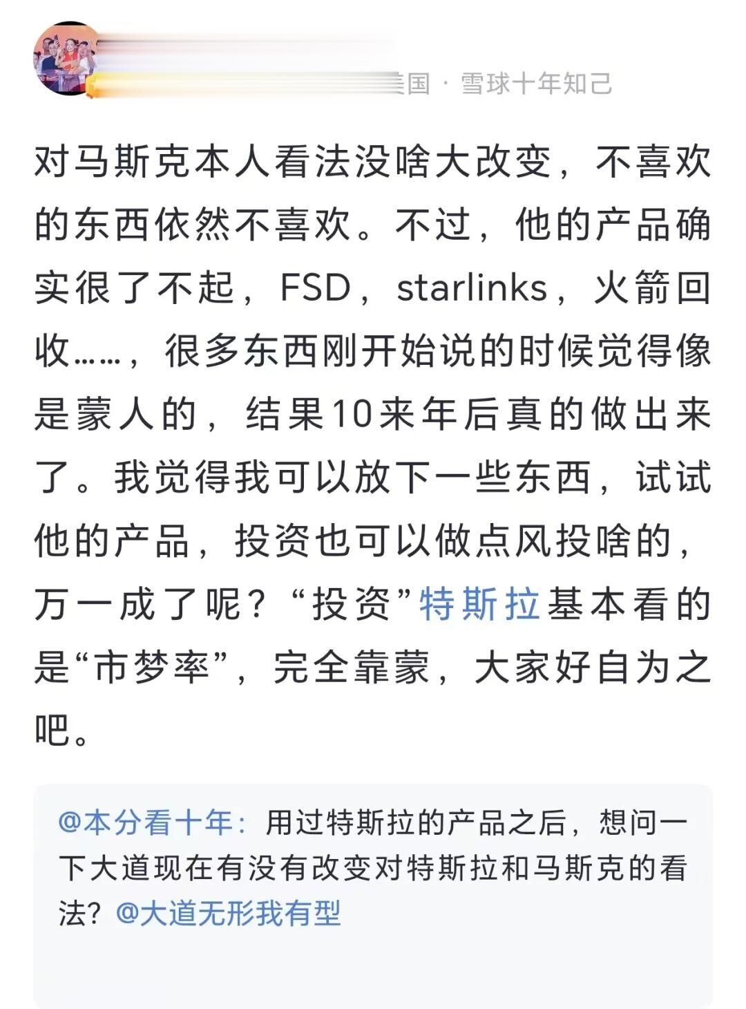随后,有网友提问,在用过特斯拉的产品之后,有没有改变对特斯拉和马斯克的看法?段永平对此回复称,对马斯克本人的看法没啥大改变,不过“他的产品确实很了不起,FSD,starlinks,火箭回收……,很多东西刚开始说的时候觉得像是蒙人的,结果10来年后真的做出来了。我觉得我可以放下一些东西,试试他的产品,投资也可以做点风投啥的”。但段永平认为,“投资”特斯拉基本看的是“市梦率”,完全靠蒙。