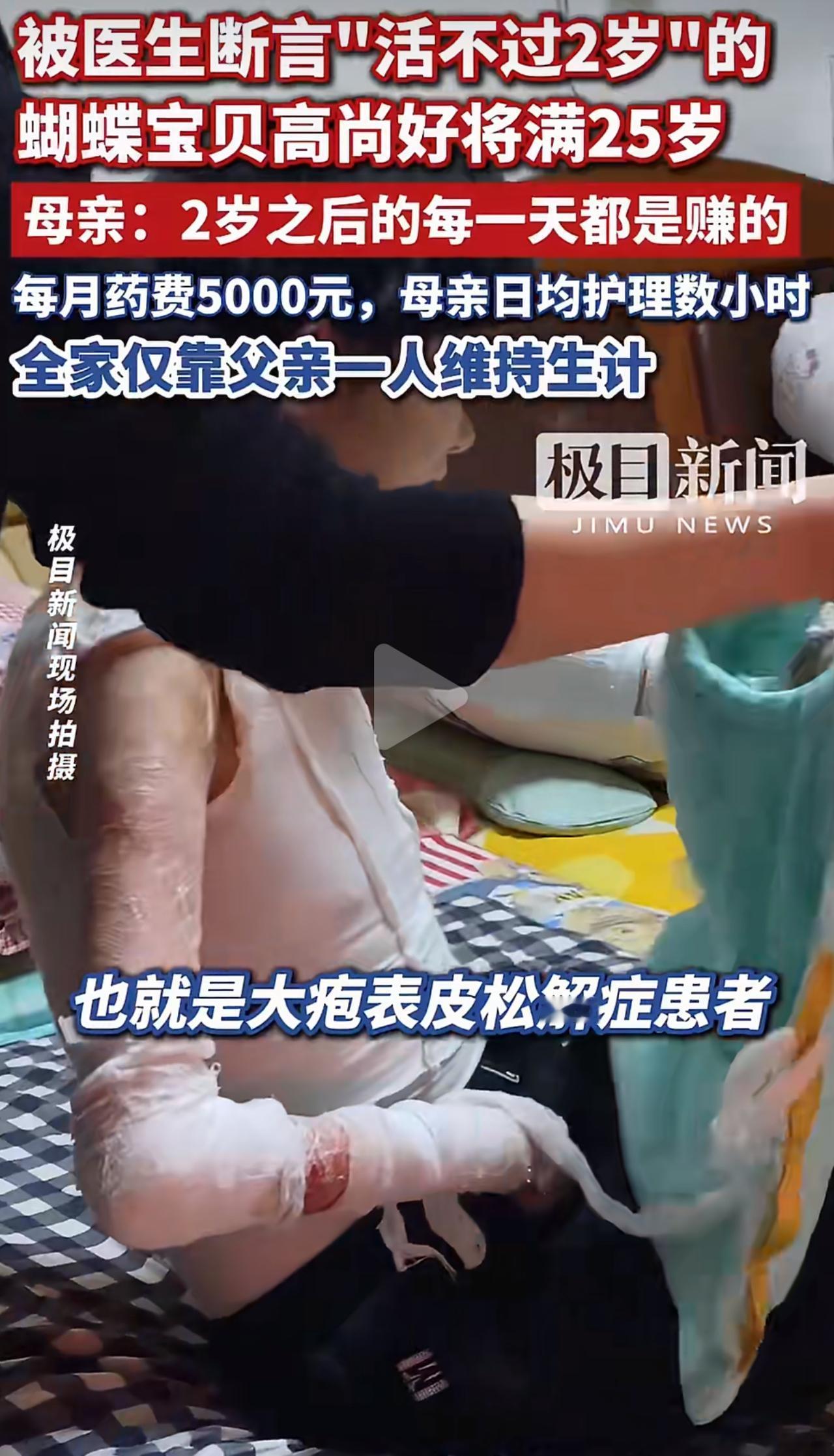 活不过两岁的魔咒,她硬生生扛了25年,5次分指手术,手指还是紧紧粘成拳头,这就是“蝴蝶宝贝”高尚好的命。 她的皮肤薄得像蝶翼,蹭一下就起疱溃烂,手指刚分开又粘回去,手术、粘连、再手术,怎么都逃不出这个死循环。术后康复疼得钻心,稍微动一动就添新伤口,疼到实在扛不住停下,手指反而粘得更紧。 妈妈每天守着她处理伤口,三天一次大护理,一弄就是三小时。进口敷料一片两百块,每月几千块开销,全靠爸爸一个人赚钱撑着。她脚变形坐轮椅,牙几乎掉光,吃软东西都磨得满嘴疱,浑身没一处好地方。 可她从没低头,爸妈拼尽全力护着她活着,她自己也没放弃,想登山,想替罕见病群体说话,盼着护理耗材能进医保,盼着大家别用异样眼光看她们。 有些病,眼下的医学确实拿它没办法,可人活着,全靠心里那股不服输的劲儿撑着。我们帮不上大忙,就多给点理解,多递点善意,别让这些拼尽全力活着的人,一个人孤零零地跟病痛死磕。蝴蝶宝贝5次手术后手指再次粘连 蝴蝶宝贝 女孩确诊“蝴蝶宝贝”皮肤一碰就碎