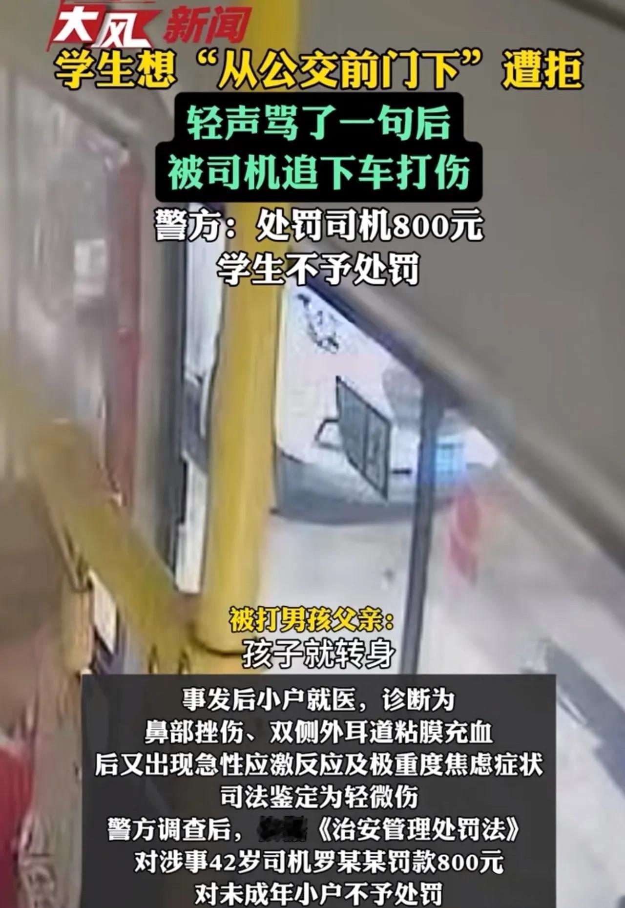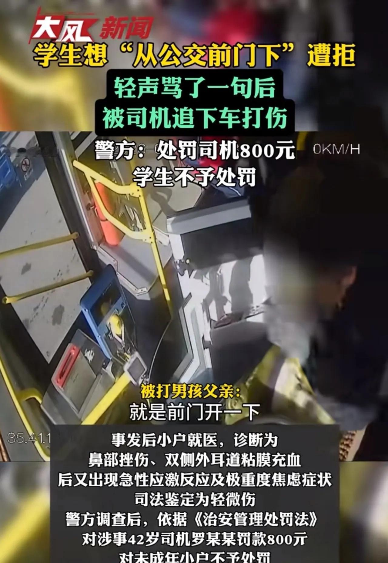 一句公交车上脱口而出的脏话,竟让16岁少年下车后遭到司机追打。当司机怒吼“替你父母管教”时,一场关于家教、暴力和法律边界的全民争论就此引爆。 那天,甘肃16岁的晓峰坐公交去图书馆,心里着急赶作业。到站时,他几步冲到前门,连喊两声:“师傅,开下前门!”司机罗某像没听见,眼睛盯着前方一动不动。晓峰急了,第三遍几乎是喊出来的。 这回司机从后视镜瞪了他一眼,扯着嗓子吼回来:“后门下!前门不能下!”晓峰憋了一肚子火,转身往后门走时,嘴里没忍住骂了句脏话。没想到,这句话被罗某听得清清楚楚。 车刚停稳,晓峰前脚下车,罗某后脚就解开安全带冲了下来。他一把揪住晓峰的衣领,拳头直接朝孩子头上脸上抡过去,嘴里还吼道:“你父母不管教你,我替他们管教!”晓峰当场被打懵,疼得直咧嘴。 晓峰顶着一脸伤回家,父母一看心疼坏了。得知是公交司机动的手,他们立刻报了警。更糟的是,晓峰事后出现了急性应激反应,被诊断为重度焦虑症,身体损伤鉴定为轻微伤。家长要求司机赔偿医药费和精神损失,事情却在这时出现了意想不到的转折。 公交公司站出来表态:“司机动手确实不对,我们批评教育。但如果家长再不依不饶,我们也要追究这孩子骂人的责任!”这番“硬气”回应,瞬间把事件推上了风口浪尖。 从法律角度看,这事其实很清楚。根据《治安管理处罚法》,司机动手殴打他人致轻微伤,明显违法。最终警方对司机罗某处以800元罚款。而晓峰作为未成年人,骂人虽不对,但情节较轻,警方以批评教育为主。法律不会支持“因为你骂我,所以我就可以打你”的逻辑。 这件事在网上炸开了锅。有网友认为“16岁还这么没教养,该打!家长教不好,社会教”;另一方则反驳“骂人是不对,但打人更错!”。还有网友指出双方都有问题:孩子缺家教,司机缺职业素养,但暴力永远不是解决问题的办法。 一场简单的车厢冲突,演变成了情、理、法的全面碰撞。它让我们思考:当口头冲突发生时,暴力“管教”的边界在哪里?服务行业从业者该如何应对压力与挑衅?而企业面对此类纠纷,怎样的回应才真正负责任? (本文基于甘肃地区已公开的社会新闻事件整理,具体细节以官方通报为准。) 这事您怎么看?如果您是家长,会如何引导孩子?如果您是司机,又会怎样处理这样的冲突?欢迎在评论区分享您的观点。