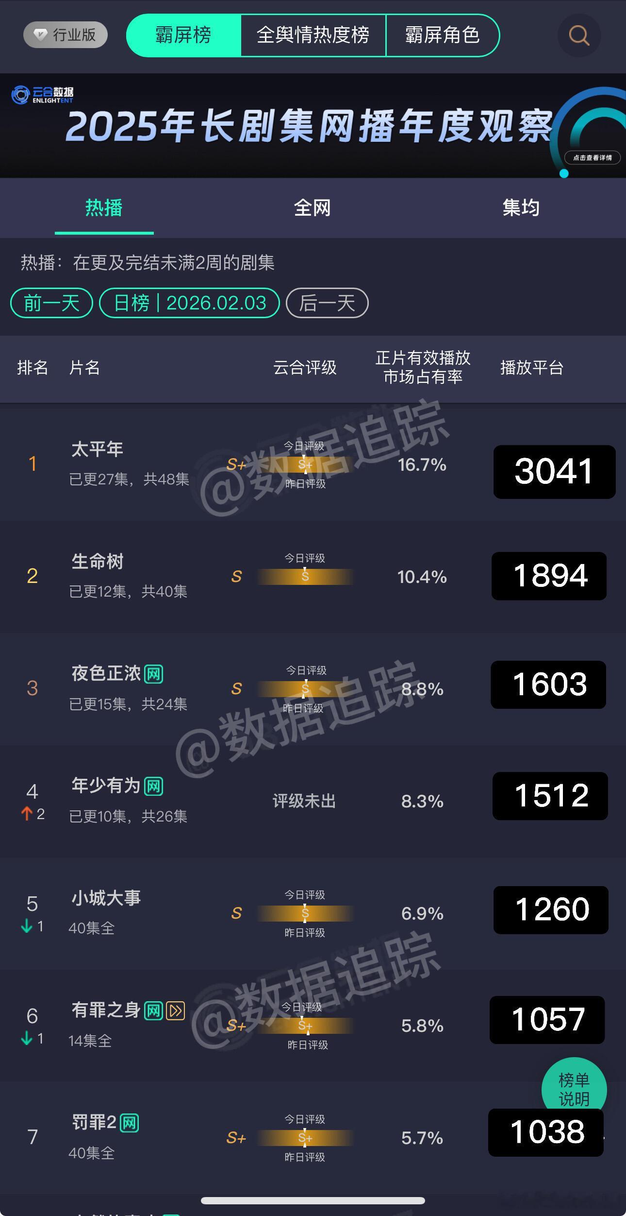 昨日云合更新了,《太平年》重回3000万,《生命树》站内热度8500单日1800