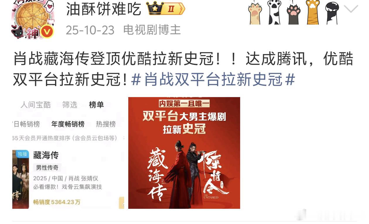 肖战藏海传优酷拉新畅销度5400万了,藏海传早就是优酷的拉新史冠了,5400万是拔高了史冠的数据