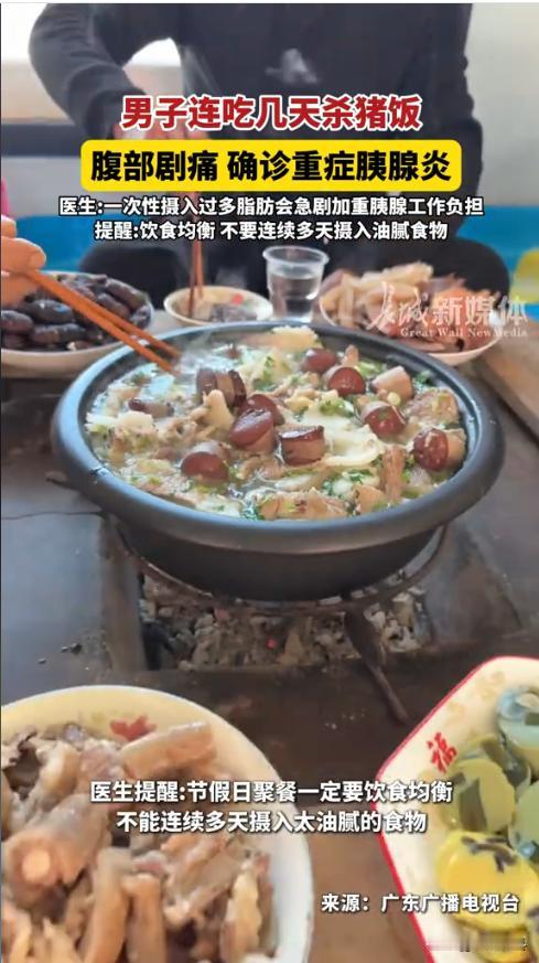 “悲剧还是发生了!”1月31日,云南宣威,一男子连着几天赴杀猪饭宴,顿顿大碗喝酒、大块吃肉,丝毫没察觉有什么不适。这天深夜,他突然腹部剧痛如刀绞,甚至浑身冒冷汗,紧急送医检查后才发现竟是大吃大喝惹的祸。网友:吃的太好也不行? 年关将近,杀猪饭是当地最具特色的宴席,亲朋好友围坐一桌,大块吃肉、大碗喝酒,气氛热烈又喜庆。但鲜有人意识到,这种高油高脂的饮食狂欢背后,潜藏着巨大的健康风险。 临近过年这几天,家家户户都在准备杀猪饭宴请。周先生也是连续几天参加亲友的宴席,顿顿都是红烧肉、灌血肠、猪蹄等高油高脂的硬菜,还少不了饮酒助兴。 起初,他只是觉得有些腹胀不适,以为是吃多了消化不良,并未在意。直到这天夜里,他突然感到腹部剧烈绞痛,连腰都直不起来,家人这才赶紧将他送往医院。 经过检查,医生诊断其为重症胰腺炎,胰腺已经出现了严重的炎症和水肿,情况十分危急。 医生表示,周先生在短时间内摄入大量高脂肪、高蛋白食物,再加上酒精的刺激,会促使胰腺急速分泌大量胰液,导致胰管内压力骤增,这才引发胰腺“自我消化”的严重后果。 这件事也提醒我们,面对杀猪饭等美食盛宴,一定要管住嘴,吃肉喝汤要适量,多吃桌上的蔬菜来平衡饮食。尤其是有胆结石、高血脂等基础病的人群,更要警惕胰腺炎的突袭。 信息来源:《1月30日报道,男子连吃几天杀猪饭腹部剧痛确诊重症胰腺炎,医生:一次性摄入过多脂肪会急剧加重胰腺工作负担。(编辑:TU)》长城新媒体