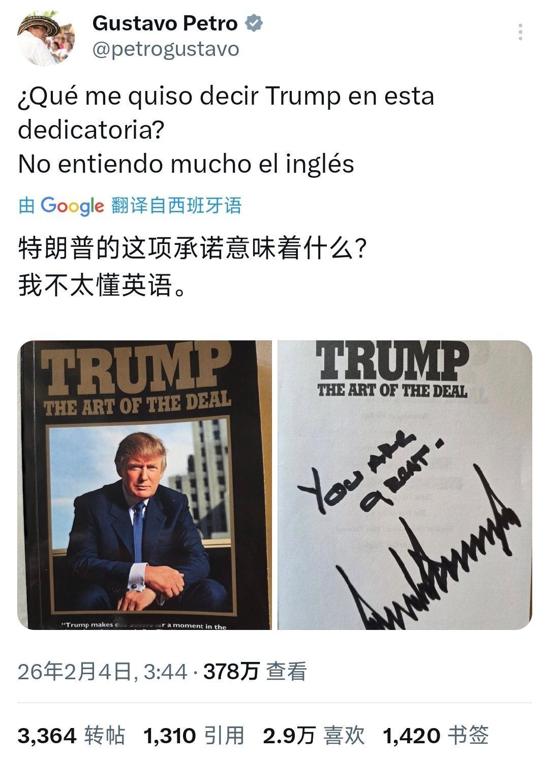 与特朗普结束会晤后,哥伦比亚总统佩特罗今天(北京时间2月4日)在社交媒体上写道:“特朗普的这项承诺意味着什么?我不太懂英语。”佩特罗展示了一张照片(图二),照片是特朗普送给了佩德罗一本签名版《交易的艺术》,特朗普还写着:“你很棒。”(You are great) [机智]评几句:爱情来得太快好像龙卷风……一个月前,委内瑞拉总统马杜罗被美军绑架之后,佩特罗还向特朗普强硬喊话“来抓我啊!”一个月后,佩德罗与特朗普在白宫举行了会晤,互赠礼物亲密互动。说好听点,这叫识时务者为俊杰。说难听点,这是杀鸡儆猴起了作用。