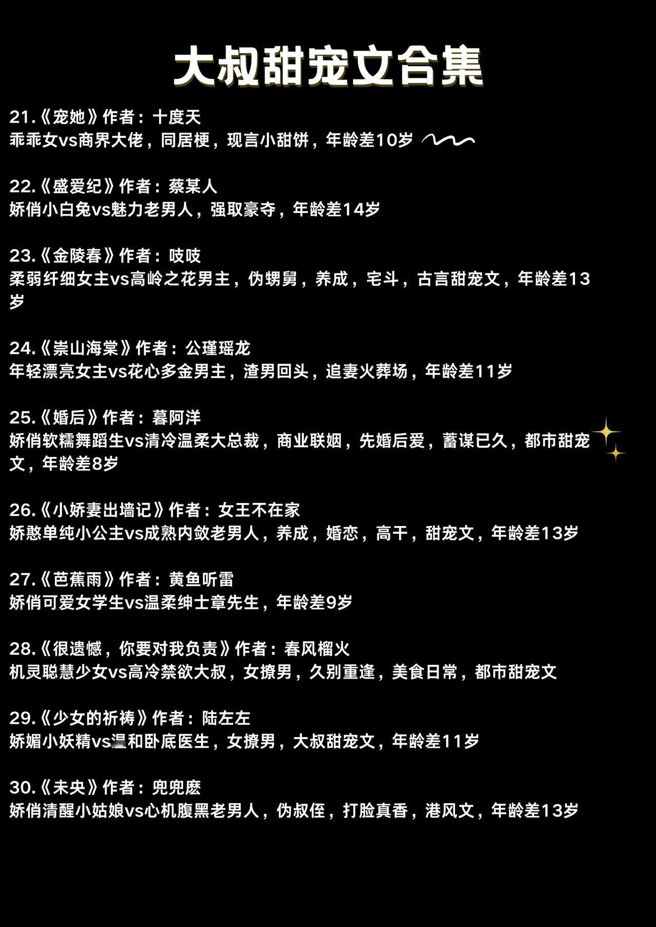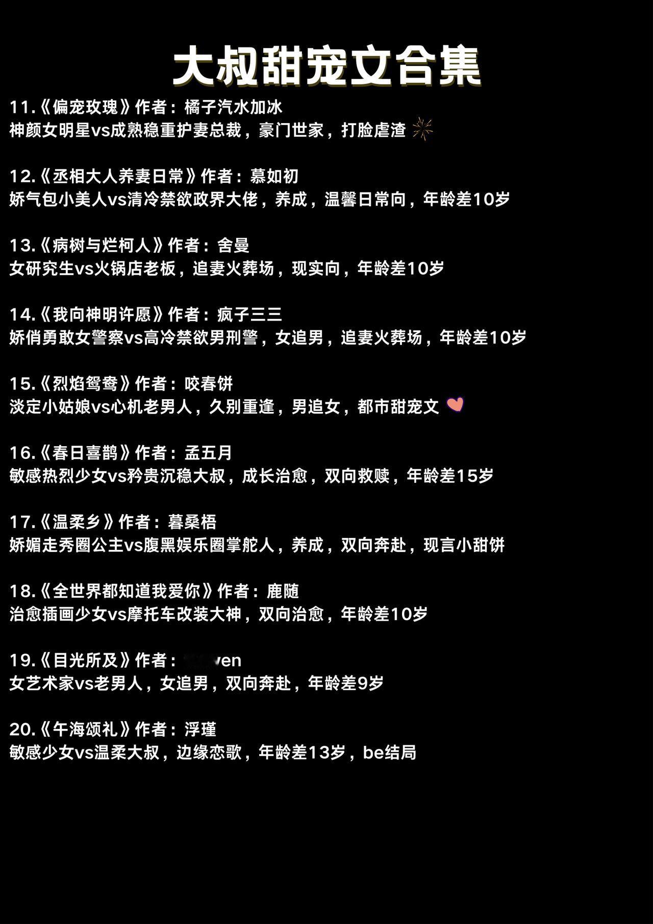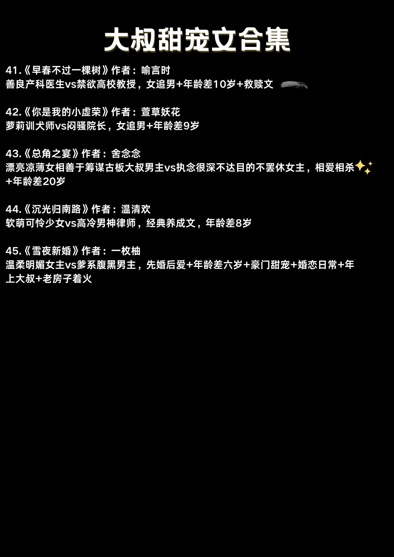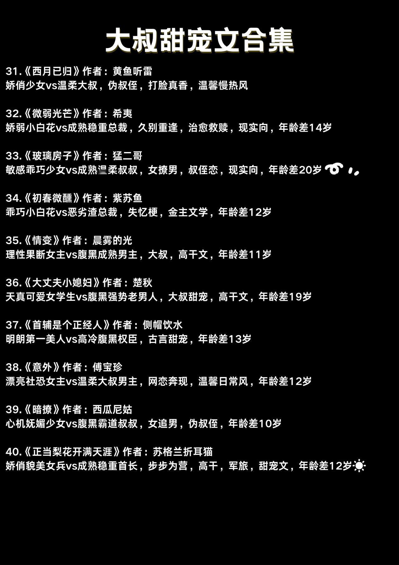 大叔甜宠文合集 1.《首辅家的小妻子》作者:其君折枝 2.《稚后》作者:菌丝木耳 3.《和离后,怀了皇帝的崽》作者:希昀 4.《重生之嫡女传记》作者:哀蓝 5.《四月爱未央》作者:人海中 6.《春雾》作者:茶衣 7.《请你坐在月明里》作者:勖力 8.《同谋》作者:也作 9.《偏爱》作者:千面怪 10.《港式恋人》作者:山伏大宝 11.《偏宠玫瑰》作者:橘子汽水加冰 12.《丞相大人养妻日常》作者:慕如初 13.《病树与烂柯人》作者:舍曼 14.《我向神明许愿》作者:疯子三三 15.《烈焰鸳鸯》作者:咬春饼 16.《春日喜鹊》作者:孟五月 17.《温柔乡》作者:暮桑梧 18.《全世界都知道我爱你》作者:鹿随 19.《目光所及》作者:fuiwen 20.《午海颂礼》作者:浮瑾 21.《宠她》作者:十度天 22.《盛爱纪》作者:蔡某人 23.《金陵春》作者:吱吱 24.《崇山海棠》作者:公瑾瑶龙 25.《婚后》作者:暮阿洋 26.《小娇妻出墙记》作者:女王不在家 27.《芭蕉雨》作者:黄鱼听雷 28.《很遗憾,你要对我负责》作者:春风榴火 29.《少女的祈祷》作者:陆左左 30.《未央》作者:兜兜麽 31.《西月已归》作者:黄鱼听雷 32.《微弱光芒》作者:希夷 33.《玻璃房子》作者:猛二哥 34.《初春微醺》作者:紫苏鱼 35.《情变》作者:晨雾的光 36.《大丈夫小媳妇》作者:楚秋 37.《首辅是个正经人》作者:侧帽饮水 38.《意外》作者:傅宝珍 39.《暗撩》作者:西瓜尼姑 40.《正当梨花开满天涯》作者:苏格兰折耳猫 41.《早春不过一棵树》作者:喻言时 42.《你是我的小虚荣》作者:萱草妖花 43.《总角之宴》作者:舍念念 44.《沉光归南路》作者:温清欢 45.《雪夜新婚》作者:一枚柚