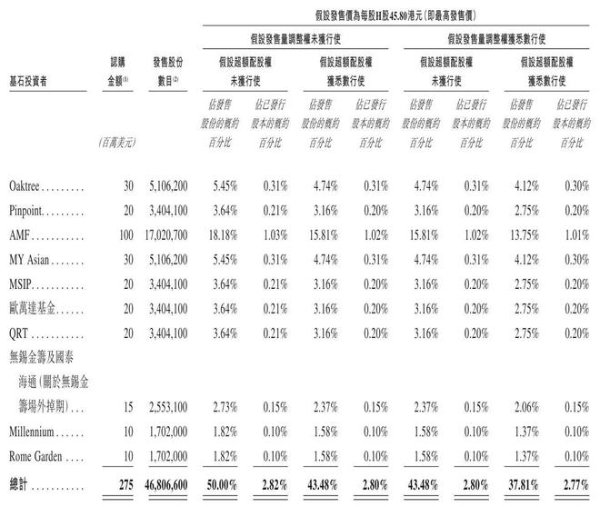 其中,Oaktree认购3000万美元,Pinpoint认购2000万美元,AMF认购1亿美元,MYAsian认购3000万美元,MSIP、欧万达基金、QRT分别认购2000万美元,无锡金筹及国泰海通(关于无锡金筹场外掉期)认购1500万美元,Millennium、RomeGarden分别认购1000万美元。