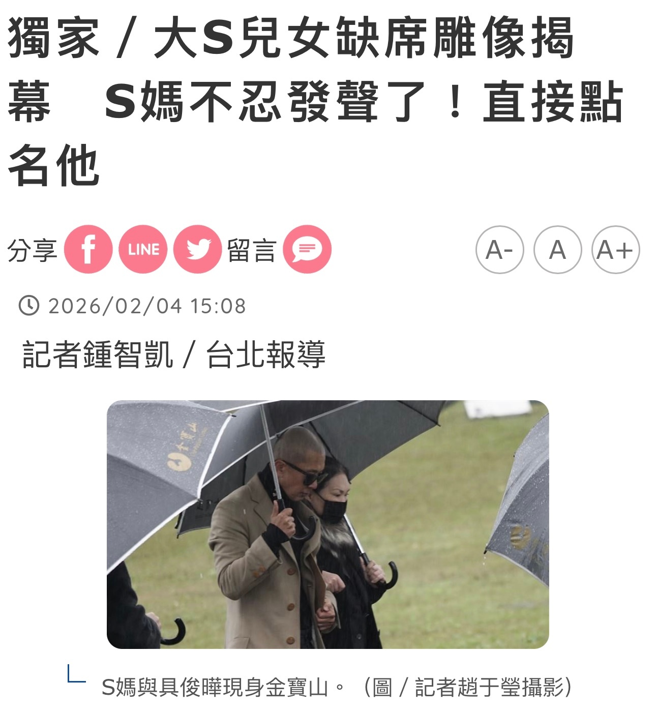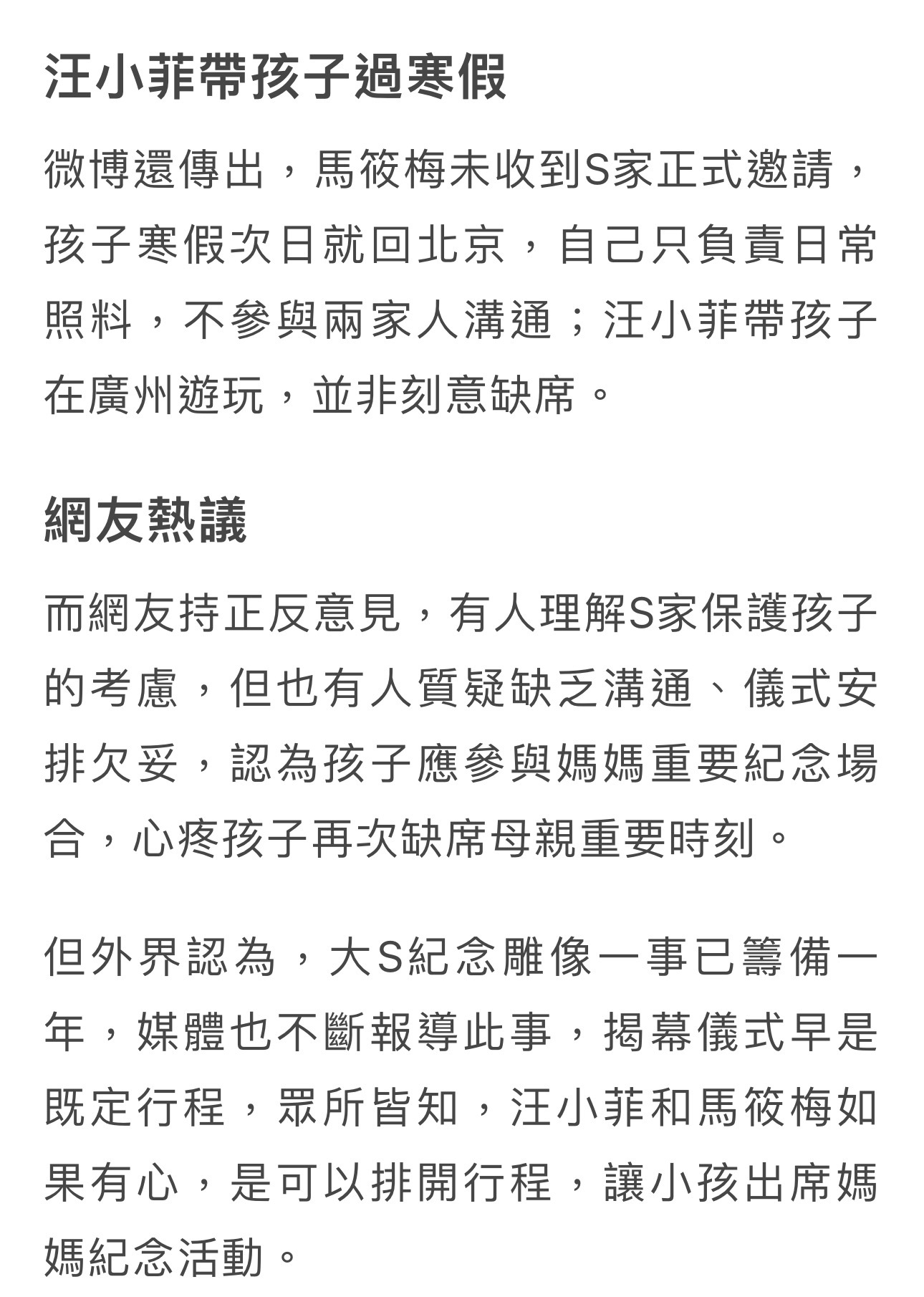 因为当天也是大S雕像揭幕仪式,但是孩子们没去现场,有传言说是S妈不让孩子出席,原因是为了保护她们,怕直接面对雕像过度悲伤。