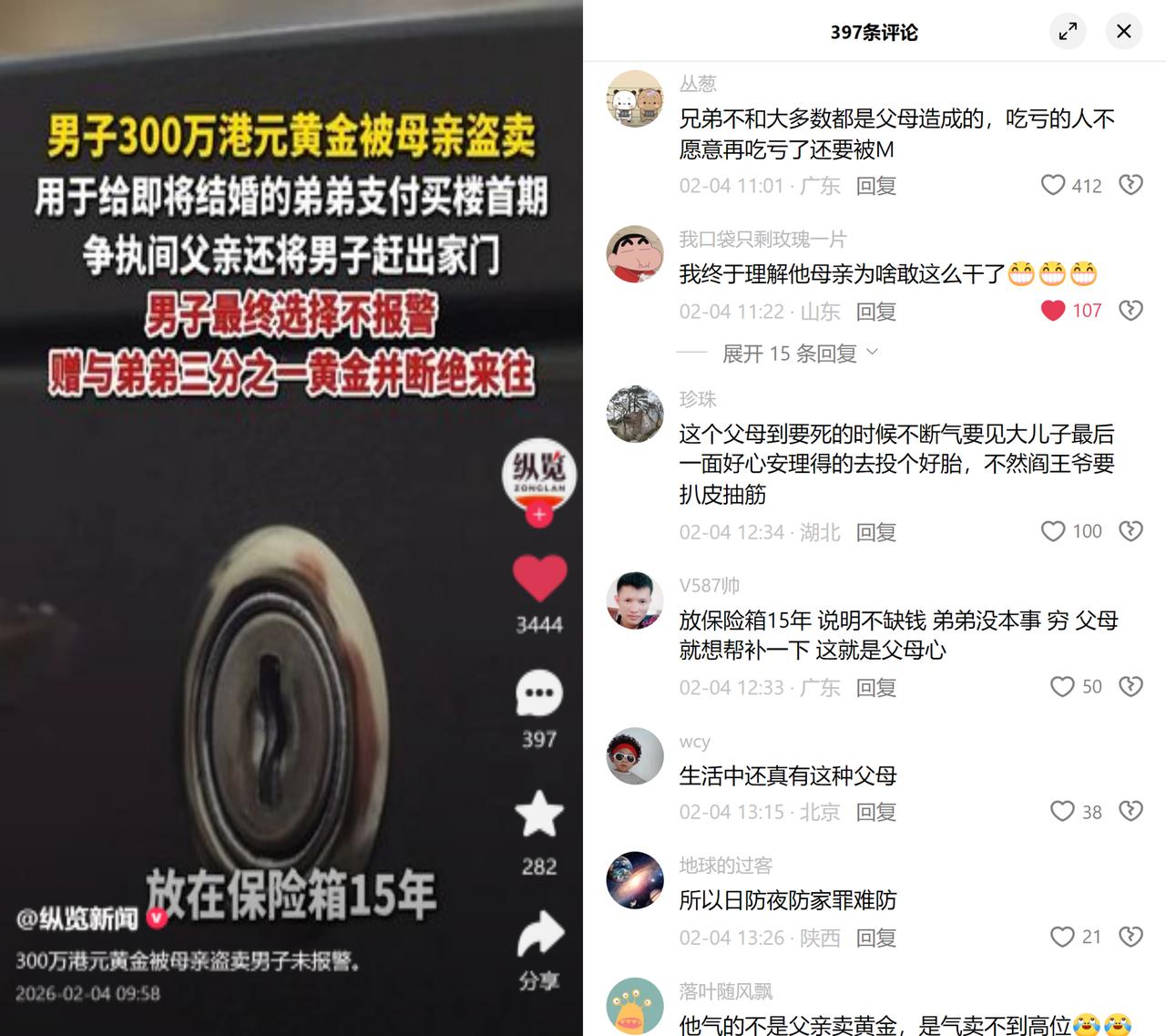 300万黄金被亲妈盗卖 男子存了15年的黄金,被母亲偷偷卖了给弟弟凑首付,争执时父亲还把他赶出家门。最后他没报警,给了弟弟三分之一份额,彻底断绝关系。 这事儿看着扎心,其实刺痛了太多家庭的隐痛。法律并非管不了,香港法律里直系亲属盗窃照样追责,可他不敢报警。为什么?因为亲情这层薄纸一旦捅破,他就要背上不孝冷血的骂名,赢了官司也输了半辈子对家庭情分的期待。 母亲敢明目张胆动手,本质是吃准了儿子的软肋:你在乎血缘,那我就用血缘绑架你。有些父母总把手心手背都是肉挂嘴边,实则偏心得明明白白,拿亲情当幌子掠夺一方的利益,去填另一方的坑。 很多人穷其一生等不来父母的一句公平,最后只能先转身,放过那个被偏心得忽略的自己。