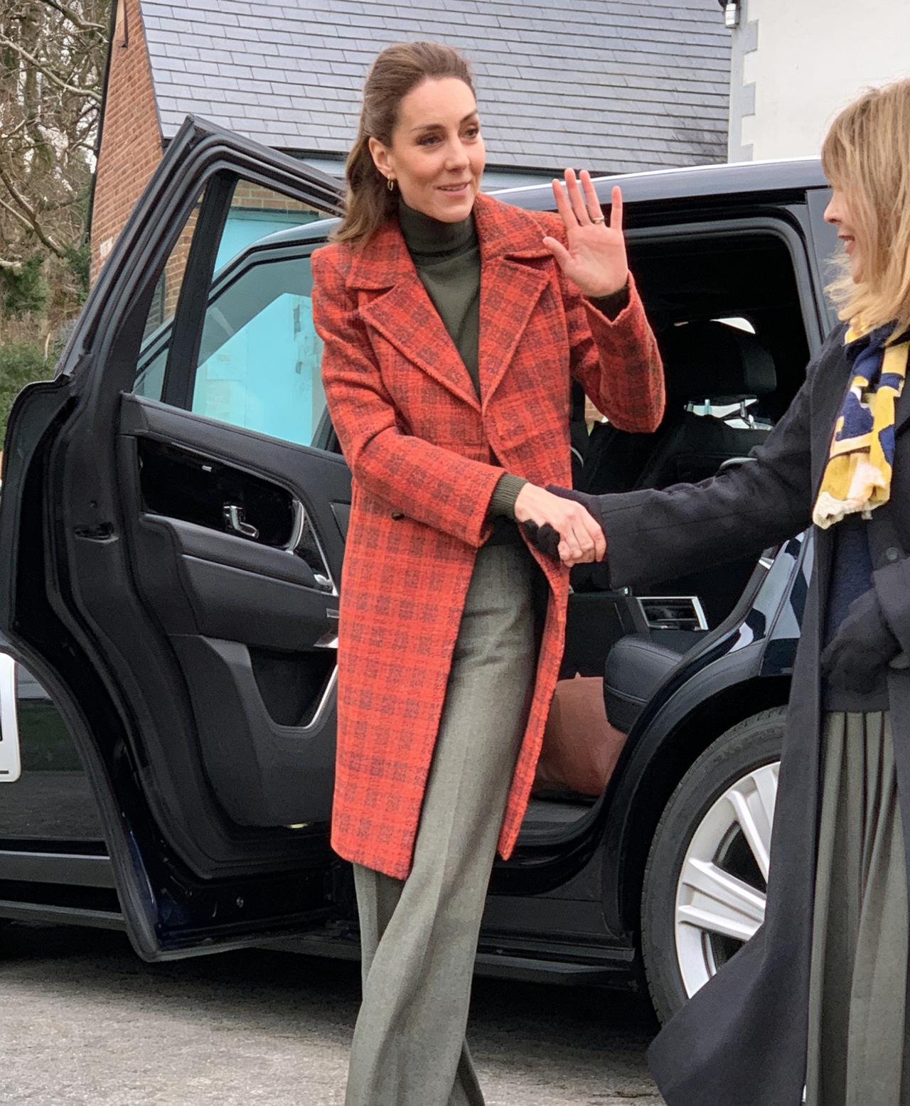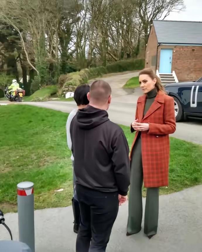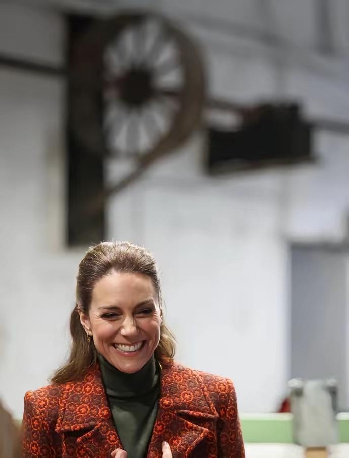 凯特王妃最新图片,这次的造型依旧是大衣搭配。这个大衣和以往的不同,这个是定制款,下边搭配绿色阔腿裤和棕色高跟鞋。干练又不失优雅,是凯特王妃的风格