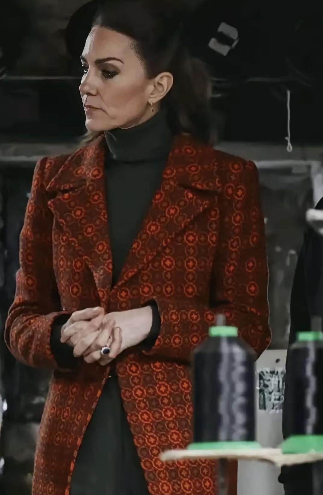 凯特王妃最新图片,这次的造型依旧是大衣搭配。这个大衣和以往的不同,这个是定制款,