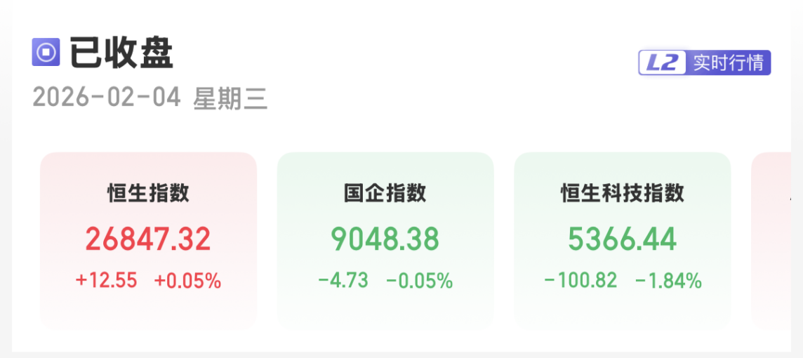 上证报中国证券网讯(卢伊记者严晓菲)2月4日,港股三大指数涨跌互现。截至收盘,恒生指数涨0.05%,报26847.32点;恒生国企指数跌0.05%,报9048.38点;恒生科技指数跌1.84%,报5366.44点。