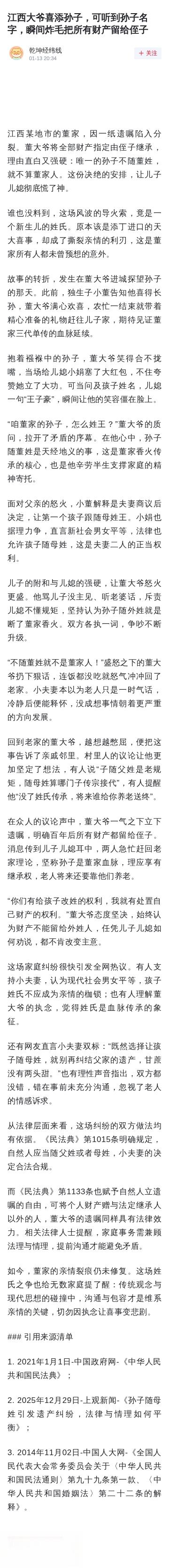江西一大爷喜添孙子,儿媳直言男女平等坚持孙子随母姓,大爷一气之下指定全部遗产由侄子继承,大家怎么看?欢迎评论区讨论
