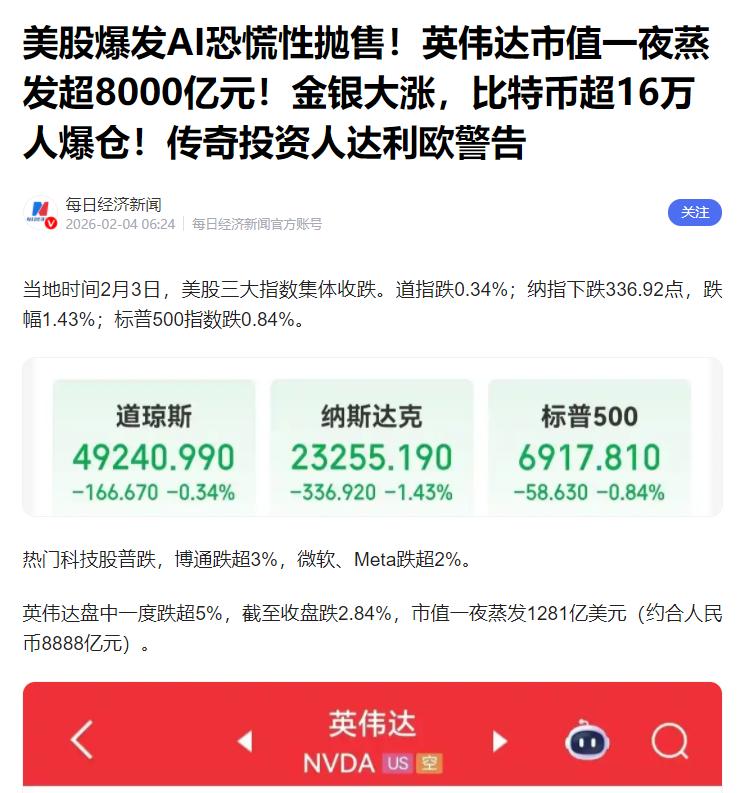 美股急跌!AI股集体抛售,英伟达一夜没了8888亿,金银却涨疯了 当地时间2月3号,美股跌得很厉害,三大主要股指全都跌了。道琼斯指数跌了0.34%,看着不多,但架不住基数大,实际跌的钱不少。 纳斯达克指数跌得最狠,一下跌了336.92点,跌幅1.43%,今年年初涨的几乎全吐回去了;标普500指数也跌了0.84%,整个美股市场都慌了。 这次大跌,最惨的就是热门科技股,尤其是做AI的股票,几乎全在跌。博通跌了3%多,微软、Meta(以前的脸书)都跌了2%多,这些平时大家都看好的大公司,当天也扛不住了。 其中最受关注的是英伟达,它是AI领域最厉害的公司,它的股价一动,整个市场都跟着受影响。 当天英伟达股价盘中一度跌了5%多,尾盘稍微涨了点,但收盘还是跌了2.84%。就这一下,它的市值就少了1281亿美元,换成人民币大概8888亿元,相当于好多家中小公司的总市值,一夜之间就没了,可见跌得有多狠。 大家肯定纳闷,好好的AI股,怎么突然就没人要了?不是碰巧,主要是三个原因凑到一起了。 首先,最近有个叫Anthropic的AI公司,出了个自动处理法律工作的工具,能自动查合同、整理法律材料,以前人工做的活它都能做。 大家一看就慌了,担心以后很多做软件、做这类服务的公司会被AI取代,就赶紧卖股票,越卖越慌,就成了疯抢着卖的局面。 其次,英伟达自己的消息也让投资者没了信心。之前有传言说,英伟达要给OpenAI投1000亿美元,大家觉得是好消息,就纷纷买它的股票。 结果2月3号当天,英伟达的CEO黄仁勋说,这笔投资只是初步想法,还没定下来。大家一看预期落空,就开始卖股票,股价也跟着跌。 还有个关键原因,就是做AI太费钱,却不怎么赚钱。这两年,科技公司在AI上花了好多钱,2025年一年就花了4000多亿美元,但整个AI行业总共才赚了100亿美元左右。 说白了就是花得多、赚得少,投资者慢慢意识到会亏更多,就赶紧把钱从AI股里撤出来了。 股市一慌,大家就不想把钱放股市了,都想找安全的地方,金银就成了首选。就在美股大跌的同一天,全球金银都在大涨,国际黄金、国内黄金都在涨,白银也跟着涨,大家都靠买金银保住自己的钱。 和金银比起来,比特币就惨多了。2月3号当天,比特币大跌,一天跌了6.83%,最低跌到9.1万美元。 好多人借了钱炒比特币,价格一跌,本金不够还债,平台就强制把他们的比特币卖掉,这就是爆仓,当天就有16万多人爆仓,好多人一夜亏光。比特币本身不值钱,全靠炒作,风险特别大,根本不适合普通人碰。 面对这种乱局,传奇投资人达利欧也发出了警告。他是桥水基金的创始人,眼光很准,他说全球快到“资本战争”的边缘了,就是各国用货币互相牵制、搞限制,现在已经很危险了,这也让投资者更慌,美股跌得更厉害。 可能有人觉得这和我们没关系,其实关系很大。就算我们不炒美股、不炒比特币,金银涨价,我们买金首饰就会更贵;全球金融市场乱,也会影响国内的股市和经济,进而影响我们的钱袋子。 提醒大家,现在投资一定要谨慎,尤其是中老年人,守住养老钱,存银行、买国债最安全,别跟风追高,免得亏光。